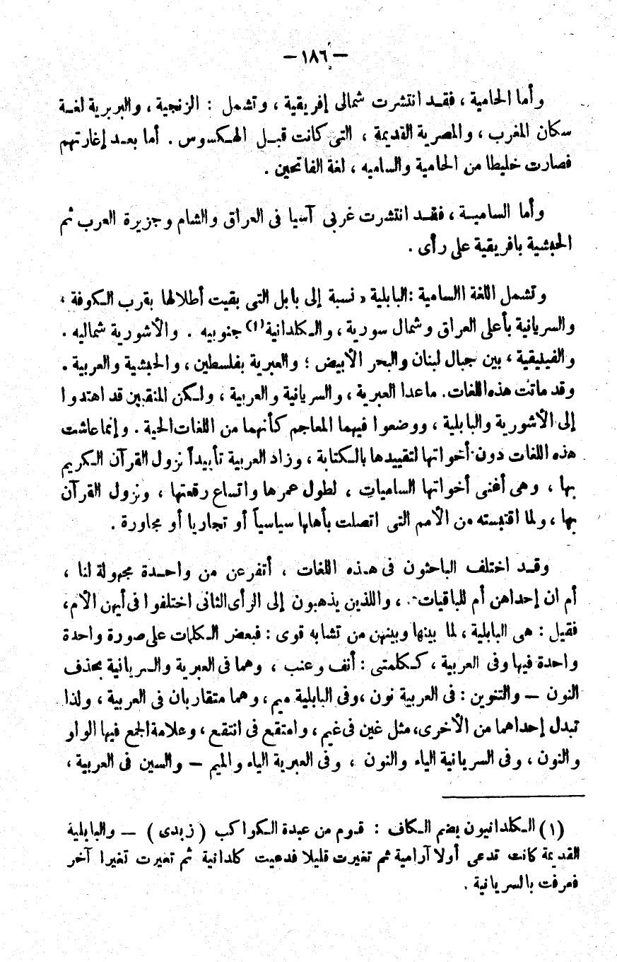 وتشمل اللغة السامية: البابلية, نسبة إلى بابل التي بقيت أطلالها بقرب الكوفة، والسريانية بأعلى العراق وشمال سورية، والكلدانية1 جنوبيه, والآشورية شماليه, والفينيقية بين جبال لبنان والبحر الأبيض، والعبرية بفلسطين، والحبشية, والعربية. وقد ماتت هذه اللغات ما عدا العبرية، والسريانية, والعربية، ولكن المنقبين قد اهتدوا إلى الآشورية والبابلية، ووضعوا فيهما المعاجم كأنهما من اللغات الحية. وإنما عاشت هذه اللغات دون أخواتها الساميات لتقييدها بالكتابة, وزاد العربية تأييدا نزول القرآن الكريم بها, وهي أغنى أخواتها الساميات؛ لطول عمرها واتساع رقعتها، ونزول القرآن بها، ولما اقتبسته من الأمم التي اتصلت بأهلها سياسيا أو تجاريا أو مجاورة.