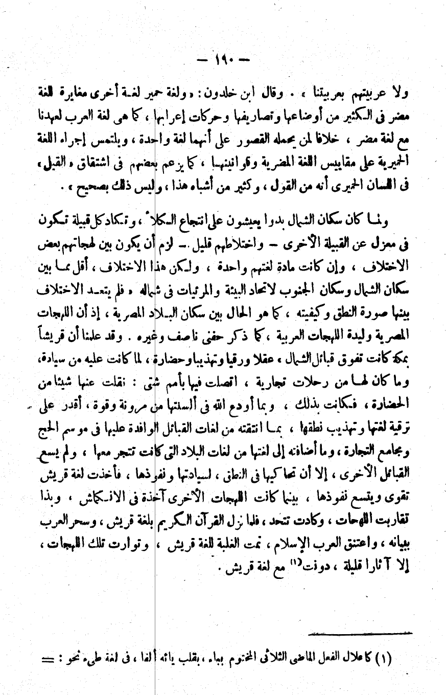 ولما كان سكان الشمال بدوا يعيشون على انتجاع الكلأ، وتكاد كل قبيلة تكون في معزل عن القبيلة الأخرى -واختلاطهم قليل- لزم أن يكون بين لهجاتهم بعض الاختلاف، وإن كانت مادة لغتهم واحدة، ولكن هذا الاختلاف أقل مما بين سكان الشمال وسكان الجنوب؛ لاتحاد البيئة والمرئيات في شماله "فلم يتعدّ الاختلاف بينها صورة النطق وكيفيته، كما هو الحال بين سكان البلاد المصرية، إذ إن اللهجات المصرية وليدة اللهجات العربية، كما ذكر حفني ناصف وغيره. وقد علمنا أن قريشا بمكة كانت تفوق قبائل الشمال" عقلا ورقيا وتهذيبا وحضارة؛ لما كانت عليه من سيادة، وما كان لها من رحلات تجارية، اتصلت فيها بأمم شتى؛ نقلت عنها شيئا من الحضارة، فكانت بذلك، وبما أودع الله في ألسنتها من مرونة وقوة أقدر على ترقية لغتها وتهذيب نطقها، بما انتقته من لغات القبائل الوافدة عليها في موسم الحج ومجامع التجارة، وما أضافته إلى لغتها من لغات البلاد التي كانت تتجر معها، ولم يسع القبائل الأخرى إلا أن تحاكيها في النطق؛ لسيادتها ونفوذها، فأخذت لغة قريش تقوى ويتسع نفوذها بينما كانت اللهجات الأخرى آخذة في الانكماش؛ وبذا تقاربت اللهجات وكادت تتحد، فلما نزل القرآن الكريم بلغة قريش, وسحر العرب ببيانه، واعتنق العرب الإسلام؛ نمت الغلبة للغة قريش وتوارت تلك اللهجات، إلا آثارا قليلة دونت1 مع لغة قريش.
