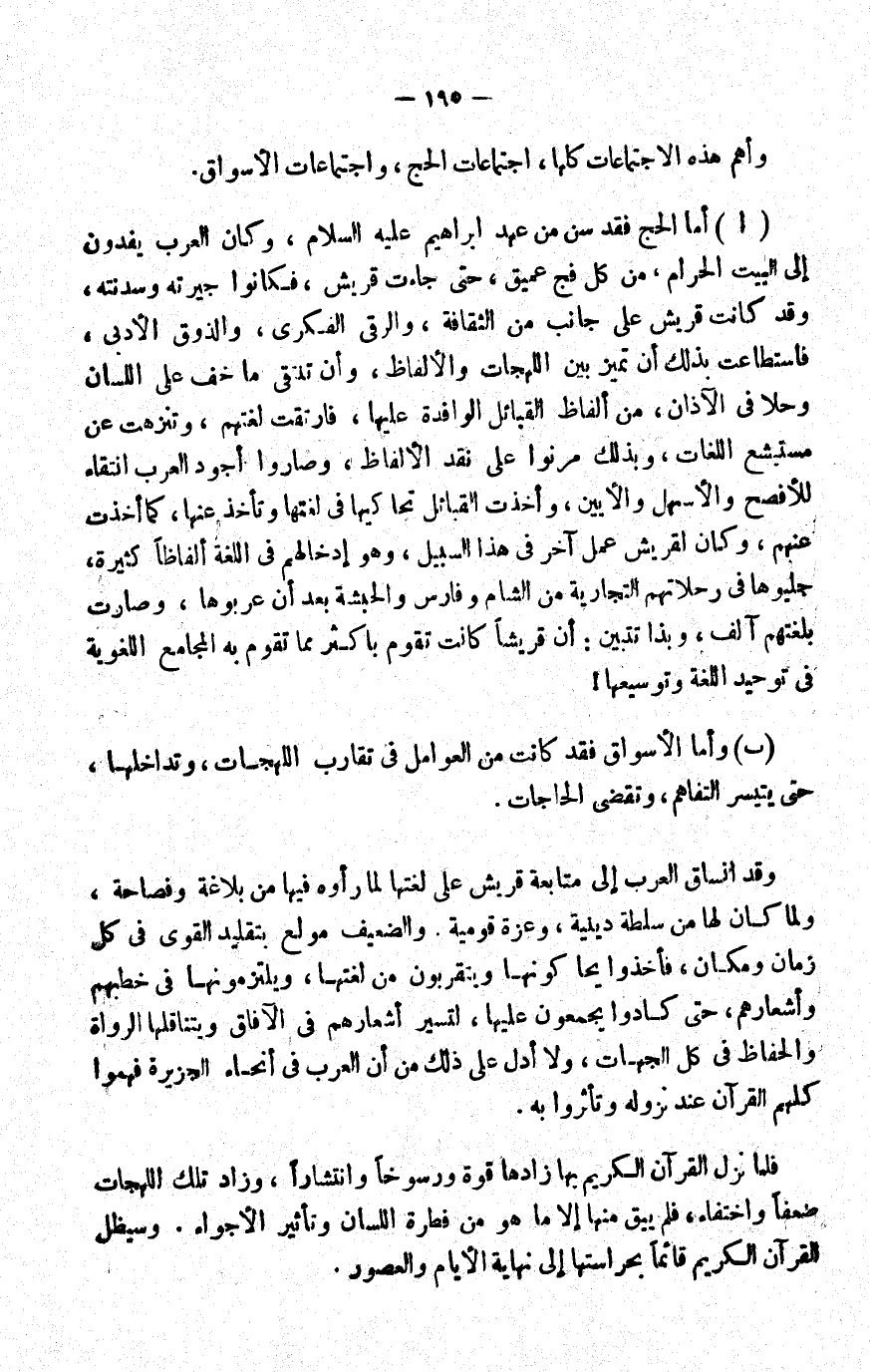أ- أما الحج فقد سن من عهد إبراهيم -عليه السلام- وكان العرب يفدون إلى البيت الحرام من كل فج عميق، حتى جاءت قريش, فكانوا جيرته وسدنته، وقد كانت قريش على جانب من الثقافة، والرقي الفكري، والذوق الأدبي، فاستطاعت بذلك أن تميز بين اللهجات والألفاظ، وأن تنتقي ما خفّ على اللسان وحلا في الآذان، من ألفاظ القبائل الوافدة عليها؛ فارتقت لغتهم، وتنزهت عن مستبشع اللغات، وبذلك مرنوا على نقد الألفاظ، وصاروا أجود العرب انتقاء للأفصح والأسهل والأبين، وأخذت القبائل تحاكيها في لغتها وتأخذ عنها كما أخذت عنهم. وكان لقريش عمل آخر في هذا السبيل، وهو إدخالهم في اللغة ألفاظا كثيرة جلبوها في رحلاتهم التجارية من الشام وفارس والحبشة بعد أن عربوها، وصارت بلغتهم آلف. وبذا تتبين: أن قريشا كانت تقوم بأكثر مما تقوم به المجامع اللغوية في توحيد اللغة وتوسيعها!