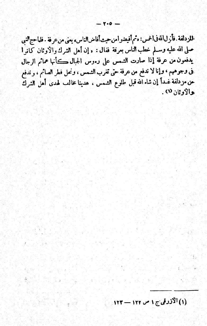 المزدلفة فأنزل الله في الحمس: {ثُمَّ أَفِيضُوا مِنْ حَيْثُ أَفَاضَ النَّاسُ} يعني: من عرفة. فلما حج النبي -صلى الله عليه وسلم- خطب الناس بعرفة فقال: "إن أهل الشرك والأوثان كانوا يدفعون من عرفة إذا صارت الشمس على رءوس الجبال كأنها عمائم الرجال في وجوههم، وإنا لا ندفع من عرفة حتى تغرب الشمس، ونحل فطر الصائم، وندفع من مزدلفة غدا -إن شاء الله- قبل طلوع الشمس، هدينا مخالف لهدي أهل الشرك والأوثان"1.