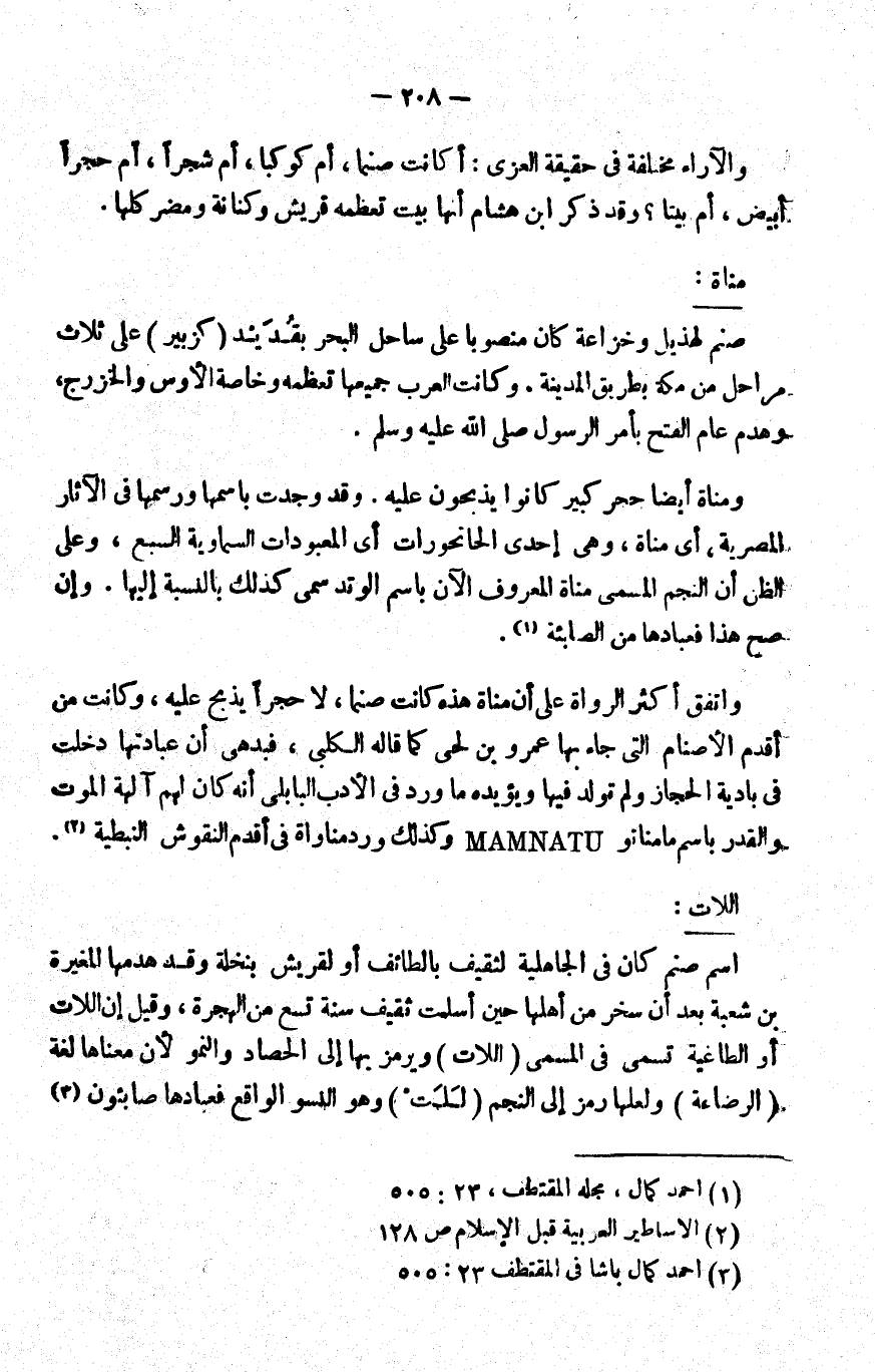 ومناة أيضا حجر كبير كانوا يذبحون عليه. وقد وجدت باسمها ورسمها في الآثار المصرية، أي: مناة، وهي إحدى الحاتحورات أي: المعبودات السماوية السبع، وعلى الظن أن النجم المسمى مناة المعروف الآن باسم الوتد سمي كذلك بالنسبة إليها, وإن صح هذا فعبادها من الصابئة1.