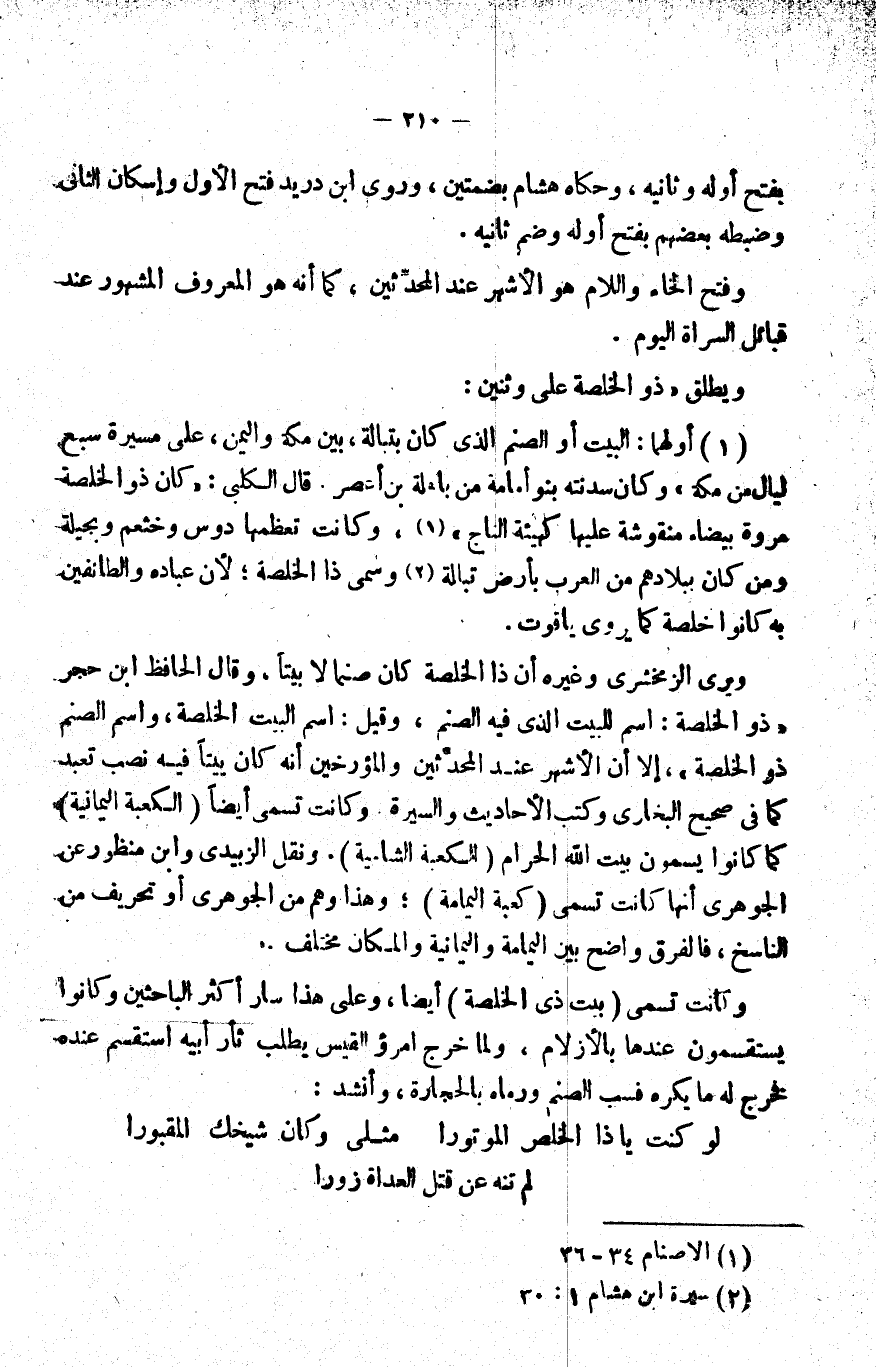 1- أولهما: البيت أو الصنم الذي كان بتبالة, بين مكة واليمن، على مسيرة سبع ليالٍ من مكة" وكان سدنته بنو أمامة من باهلة بن أعصر. قال الكلبي: "كان ذو الخلصة مروة بيضاء منقوشة عليها كهيئة التاج"1، وكانت تعظمها دوس وخثعم وبجيلة ومن كان ببلادهم من العرب بأرض تبالة2, وسمي ذا الخلصة؛ لأن عباده والطائفين به كانوا خلصة كما يروي ياقوت.
