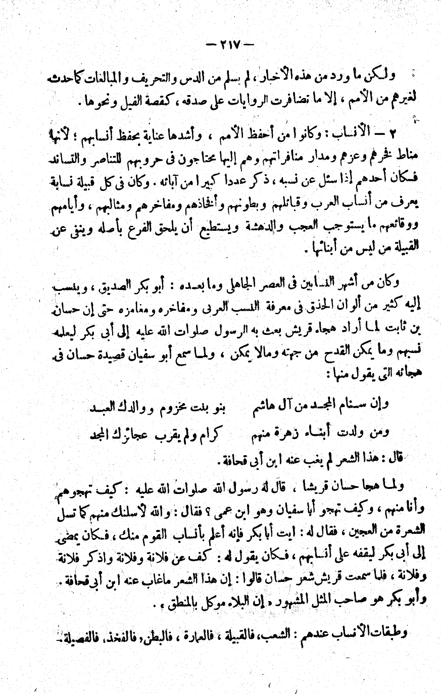 وكان من أشهر النسابين في العصر الجاهلي وما بعده: أبو بكر الصديق، وينسب إليه كثير من ألوان الحذق في معرفة النسب العربي ومفاخره ومغامزه, حتى إن حسان بن ثابت لما أراد هجاء قريش بعث به الرسول -صلوات الله عليه- إلى أبي بكر؛ ليعلمه نسبهم وما يمكن القدح من جهته وما لا يمكن. ولما سمع أبو سفيان قصيدة حسان في هجائه التي يقول منها: