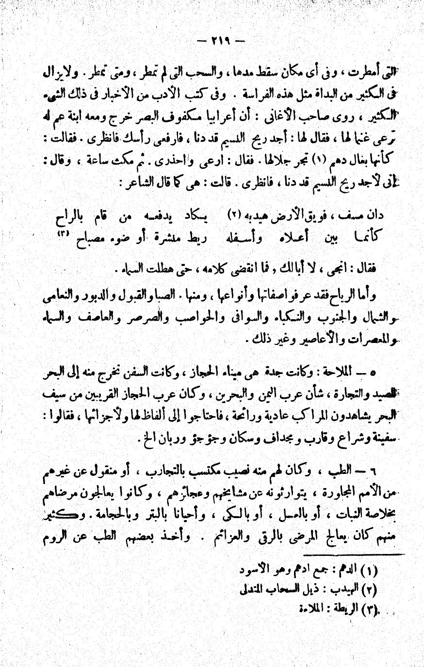 التي أمطرت، وفي أي مكان سقط مطرها، والسحب التي لم تمطر، ومتى تمطر, ولا يزال في الكثير من البداة مثل هذه الفراسة. وفي كتب الأدب من الأخبار في ذلك الشيء الكثير، روى صاحب الأغاني: أن أعرابيا مكفوف البصر خرج ومعه ابنة عم له ترعى غنما لها، فقال لها: أجد ريح النسيم قد دنا، فارفعي رأسك فانظري. فقالت: كأنها بغال دهم1 تجر جلالها. فقال: ارعي واحذري. ثم مكث ساعة، وقال: إني لأجد ريح النسيم قد دنا، فانظري. قالت: هي كما قال الشاعر: