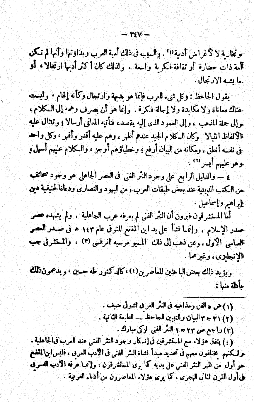 4 يتفق هؤلاء مع المستشرقين في إنكار وجود النثر الفني عند العرب في الجاهلية، ولكنهم يختلفون معهم في تحديد مبدأ نشأة النثر الفني في الأدب العربي، فليس ابن المقفع هو أول من ظهر النثر الفني على يديه كما يرى المستشرقون، وإنما عرفه الأدب العربي في أول القرن الثاني الهجري، كما يرى هؤلاء المعاصرون من أدباء العربية.
