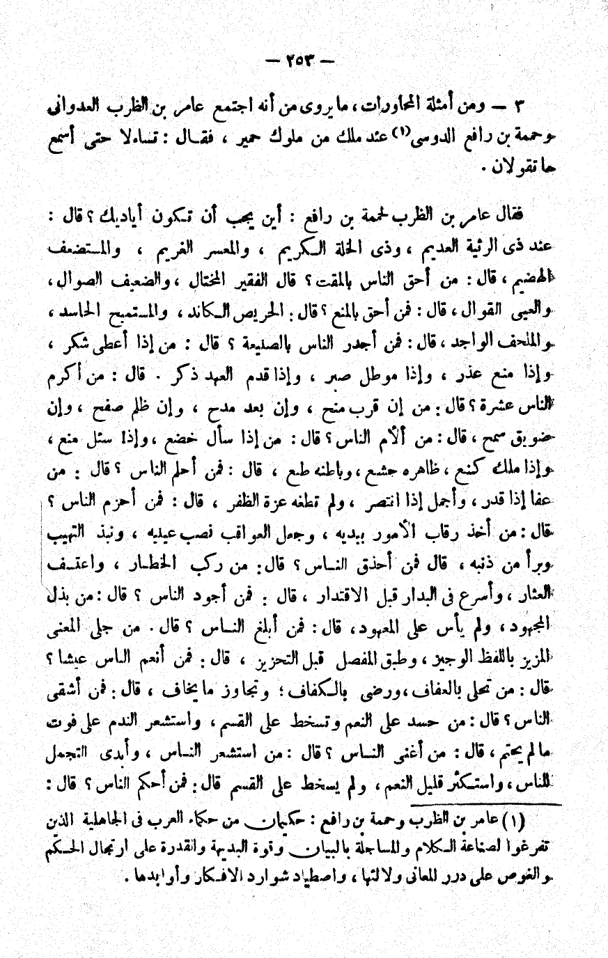 فقال عامر بن الظرب لحممة بن رافع: أين يجب أن تكون أياديك؟ قال: عند ذي الرئية العديم، وذي الخلة الكريم، والمعسر الغريم، والمستضعف الهضيم, قال: من أحق الناس بالمقت؟ قال: الفقير المختال، والضعيف الصوال، والعيي القوال، قال: فمن أحق بالمنع؟ قال: الحريص الكائد، والمستميح الحاسد، والملحف الواجد، قال: فمن أجدر الناس بالصنيعة؟ قال: من إذا أعطي شكر، وإذا منع عذر، وإذا مُوطِل صبر، وإذا قدم العهد ذكر. قال: من أكرم الناس عشرة؟ قال: من إن قرب منح، وإن بعد مدح، وإن ظلم صفح، وإن ضُويق سمح، قال: من ألأم الناس؟ قال: من إذا سأل خضع، وإذا سئل منع، وإذا ملك كنع، ظاهره جشع، وباطنه طمع، قال: فمن أحلم الناس؟ قال: من عفا إذا قدر، وأجمل إذا انتصر، ولم تطغه عزة الظفر، قال: فمن أحزم الناس؟ قال: من أخذ رقاب الأمور بيديه، وجعل العواقب نصب عينيه، ونبذ التهيب, وبرئ من ذنبه، قال: فمن أحذق الناس؟ قال: من ركب الخطار، واعتسف العثار، وأسرع في البدار قبل الاقتدار، قال: فمن أجود الناس؟ قال: من بذل المجهود، ولم يأس على المعهود، قال: فمن أبلغ الناس؟ قال: من جلّى المعنى المزيز باللفظ الوجيز، وطبق المفصل قبل التحزيز، قال: فمن أنعم الناس عيشا؟ قال: من تحلى بالعفاف، ورضي بالكفاف، وتجاوز ما يخاف، قال: فمن أشقى الناس؟ قال: من حسد على النعم وتسخط على القسم، واستشعر الندم على فوت ما لم يحتم، قال: من أغنى الناس؟ قال: من استشعر الناس، وأبدى التجمل للناس، واستكثر قليل النعم، ولم يسخط على القسم, قال: فمن أحكم الناس؟ قال: