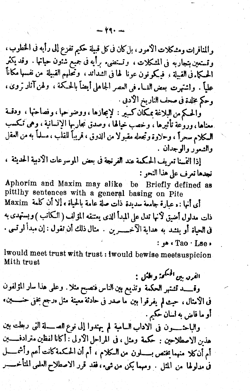Aphorim and Maxim may alike be Briefly defined as pittlhy sentences with a general basing on pite. أي: إنها "عبارة جامعة سديدة, ذات صلة عامة بالحياة" إلا أن كلمة Maxim ذات مدلول أضيق؛ لأنها تدل على المبدأ الذي يعتنقه المؤلف "الكاتب" ويستهدي به في الحياة أو ينشد به هداية الآخرين. مثال ذلك: أن تقول: إن مبدأ لوتسي, "Tao Lse" هو: