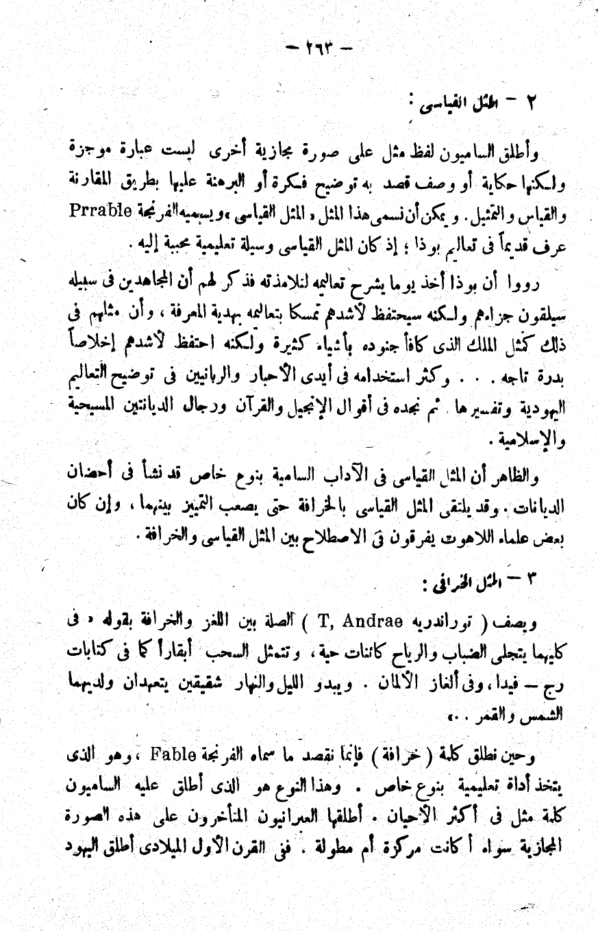 وحين نطلق كلمة "خرافة" فإنما نقصد ما سماه الفرنجة Fable، وهو الذي يتخذ أداة تعليمية بنوع خاص. وهذا النوع هو الذي أطلق عليه الساميون كلمة مثل في أكثر الأحيان, أطلقها العبرانيون المتأخرون على هذه الصورة المجازية سواء أكانت مركزة أم مطولة. ففي القرن الأول الميلادي أطلق اليهود