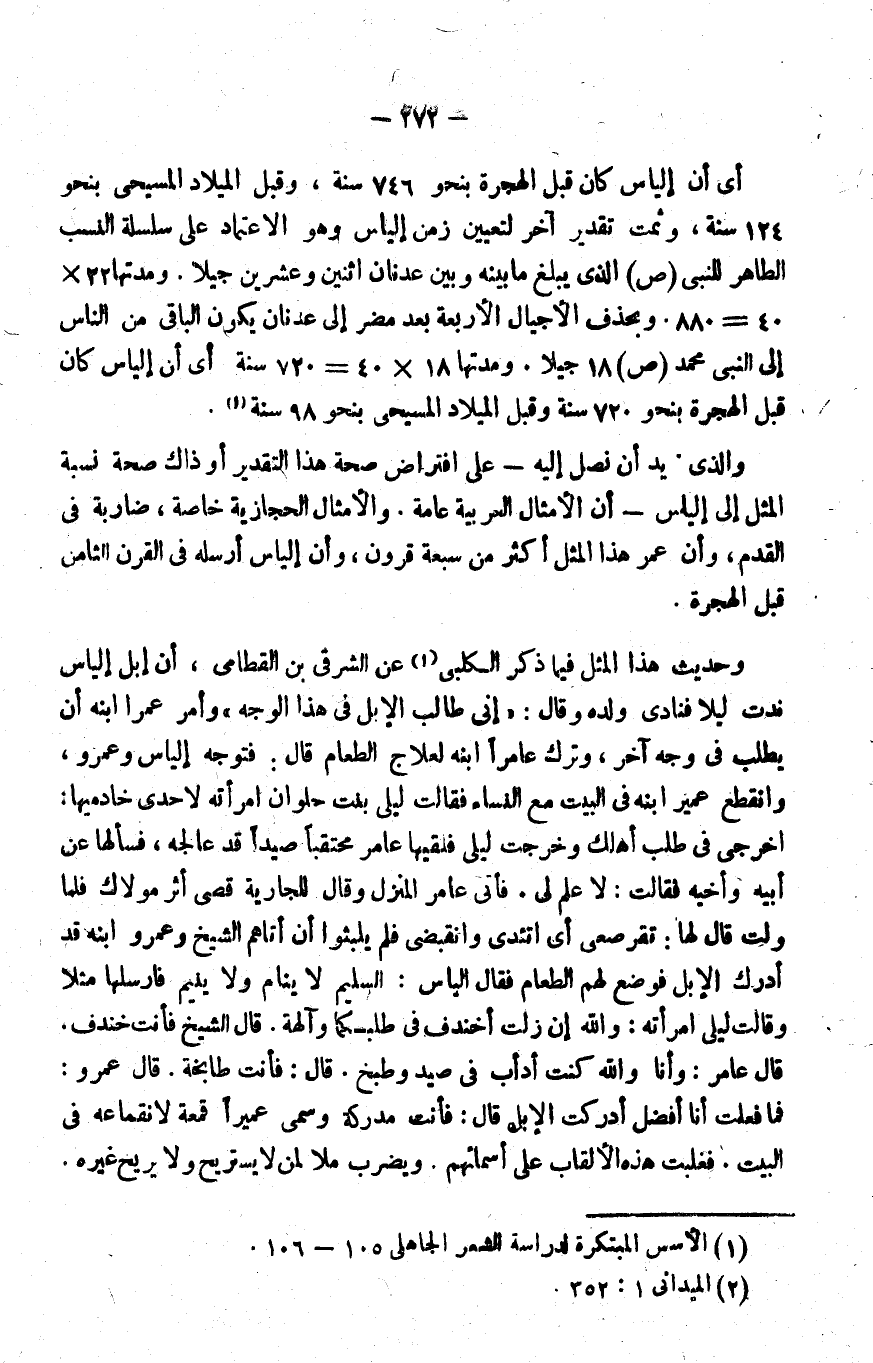أي: إن إلياس كان قبل الهجرة بنحو 746 سنة، وقبل الميلاد المسيحي بنحو 124 سنة، وثمت تقدير آخر لتعيين زمن إلياس وهو الاعتماد على سلسلة النسب الطاهر للنبي "صلى الله عليه وسلم" الذي يبلغ ما بينه وبين عدنان اثنين وعشرين رجلا. ومدتها 22×40=880. وبحذف الأجيال الأربعة بعد مضر إلى عدنان يكون الباقي من الناس إلى النبي محمد "صلى الله عليه وسلم" جيلا, ومدتها 18×40=720 سنة, أي: إن إلياس كان قبل الهجرة بنحو 720 سنة, وقبل الميلاد المسيحي بنحو 98 سنة1.