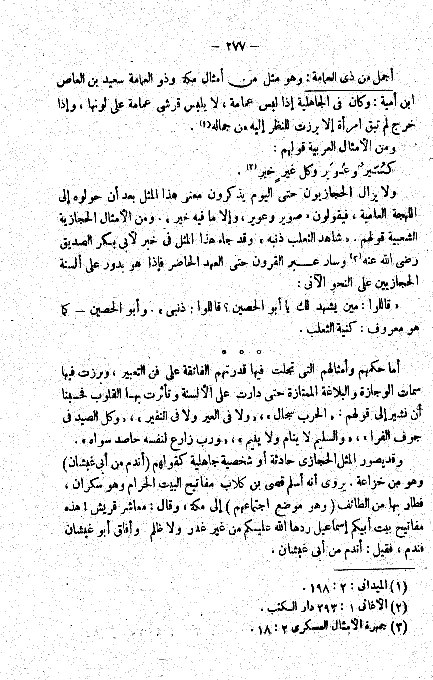 ولا يزال الحجازيون حتى اليوم يذكرون معنى هذا المثل بعد أن حولوه إلى اللهجة العامية، فيقولون: "صوير وعوير, وإلا ما فيه خير". ومن الأمثال الحجازية الشعبية قولهم: "شاهد الثعلب ذنبه" وقد جاء هذا المثل في خبر لأبي بكر الصديق -رضي الله عنه3- وسار عبر القرون حتى العهد الحاضر, فإذا هو يدور على ألسنة الحجازيين على النحو الآتي: