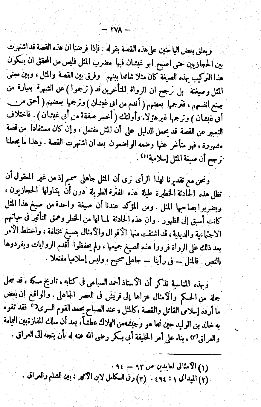 وبهذه المناسبة نذكر أن الأستاذ أحمد السباعي في كتابه "تاريخ مكة" قد سجل جملة من الحكم والأمثال عزاها إلى قريش في العصر الجاهلي. والواقع أن بعض ما أرده إسلامي القائل والقصة، كالمثل: "عند الصباح يحمد القوم السرى"2, فقد تفوه به خالد بن الوليد حين نجا هو وجيشه من الهلاك عطشا، بعد أن سلك المفازة بين اليمامة والعراق3 بناء على أمر الخليفة أبي بكر -رضي الله عنه- له بأن يتجه إلى العراق.