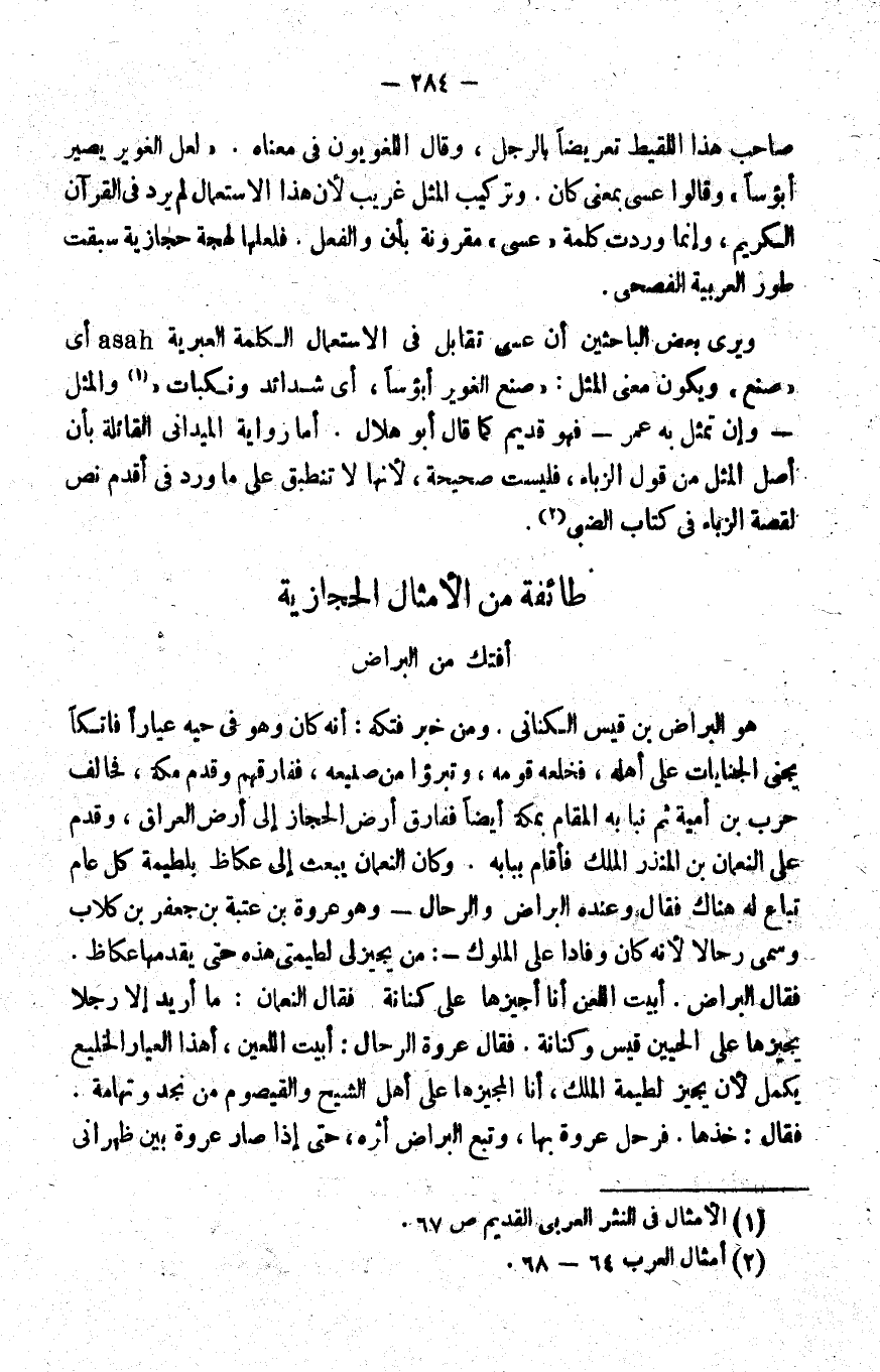 ويرى بعض الباحثين أن عسى تقابل في الاستعمال الكلمة العبرية asah أي: "صنع" ويكون معنى المثل: "صنع الغوير أبؤسا، أي: شدائد ونكبات"1 والمثل -وإن تمثل به عمر- فهو قديم كما قال أبو هلال. أما رواية الميداني القائلة بأن أصل المثل من قول الزباء، فليست صحيحة؛ لأنها لا تنطبق على ما ورد في أقدم نص لقصة الزباء في كتاب الضبي2.