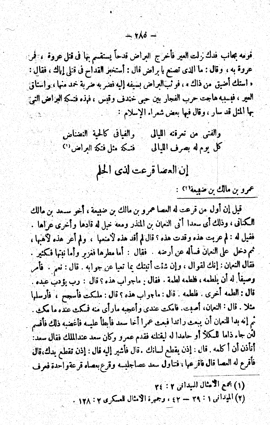قيل: إن أول من قرعت له العصا عمرو بن مالك بن ضبيعة، أخو سعد بن مالك الكناني، وذلك أن سعدا أتى النعمان بن المنذر ومعه خيل له قادها وأخرى عراها, فقيل له: لم عريت هذه وقدت هذه؟ قال: لم أقد هذه لأمنعها، ولم أعر هذه لأهبها، ثم دخل على النعمان فسأله عن أرضه, فقال: أما مطرها فغزير وأما نبتها فكثير. فقال النعمان: إنك لقوال, وإن شئت أتيتك بما تعيا عن جوابه. قال: نعم. فأمر وصيفا له أن يلطمه، فلطمه لطمة. فقال: ما جواب هذه؟ قال: رب يؤدب عبده. قال: الطمه أخرى, فلطمه. قال: ما جواب هذه؟ قال: ملكت فأسجح، فأرسلها مثلا. قال النعمان: أصبت فامكث عندي, وأعجبه ما رأى منه فمكث عنده ما مكث. ثم إنه بدا للنعمان أن يبعث رائدا فبعث عمرا أخا سعد, فأبطأ عليه فأغضبه ذلك, فأقسم: لئن جاء ذاما للكلأ أو حامدا له ليقتلنه, فقدم عمرو وكان سعد عند الملك, فقال سعد: أتأذن أن أكلمه؟ قال: إذن يقطع لسانك. قال: فأشير إليه؟ قال: إذن تقطع يدك، قال: فأقرع له العصا؟ قال: فأقرعها، فتناول سعد عصا جليسه وقرع بعصاه قرعة واحدة فعرف