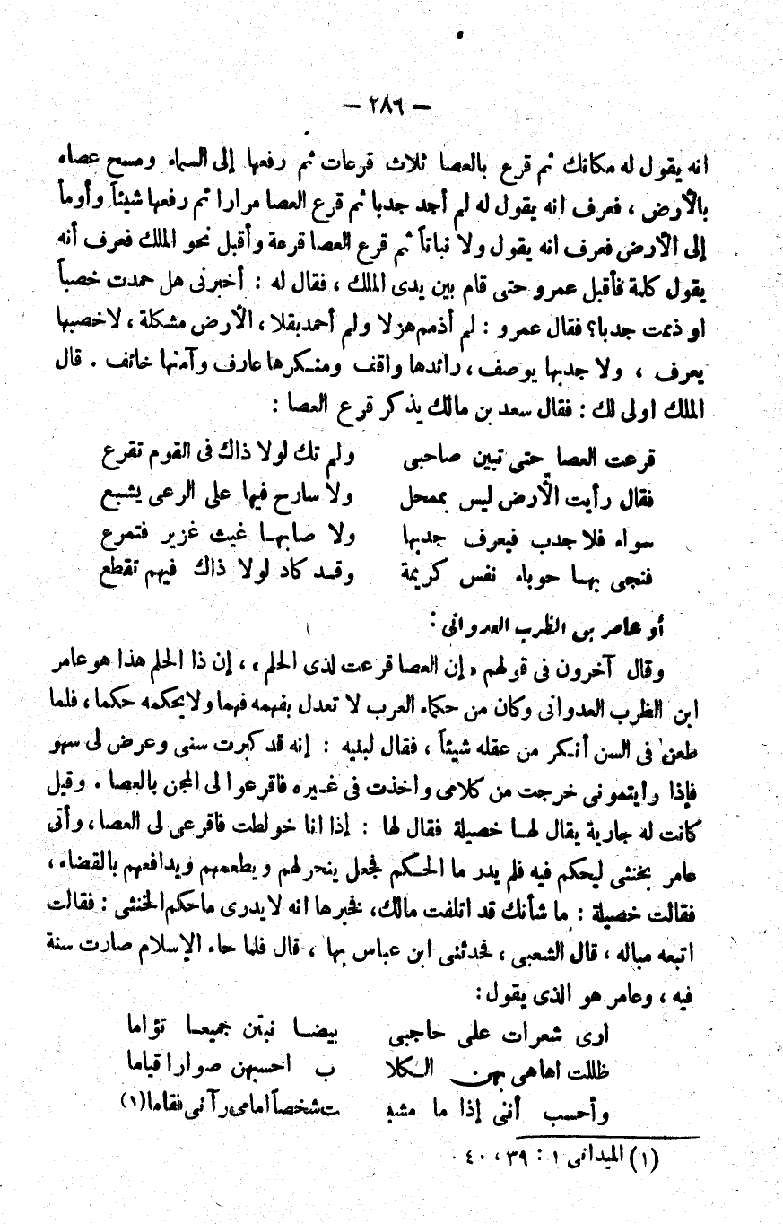 أنه يقول له: مكانك, ثم قرع بالعصا ثلاث قرعات, ثم رفعها إلى السماء ومسح عصاه بالأرض، فعرف أنه يقول له: لم أجد جدبا, ثم قرع العصا مرارا ثم رفعها شيئا وأومأ إلى الأرض فعرف أنه يقول: ولا نباتا, ثم قرع العصا قرعة وأقبل نحو الملك فعرف أنه يقول كلمة, فأقبل عمرو حتى قام بين يدي الملك، فقال له: أخبرني هل حمدت خصبا أو ذممت جدبا؟ فقال عمرو: لم أذمم هزلا ولم أحمد بقلا، الأرض مشكلة، لا خصبها يعرف، ولا جدبها يوصف، رائدها واقف ومنكرها عارف وآمنها خائف. قال الملك: أولى لك, فقال سعد بن مالك يذكر قرع العصا: