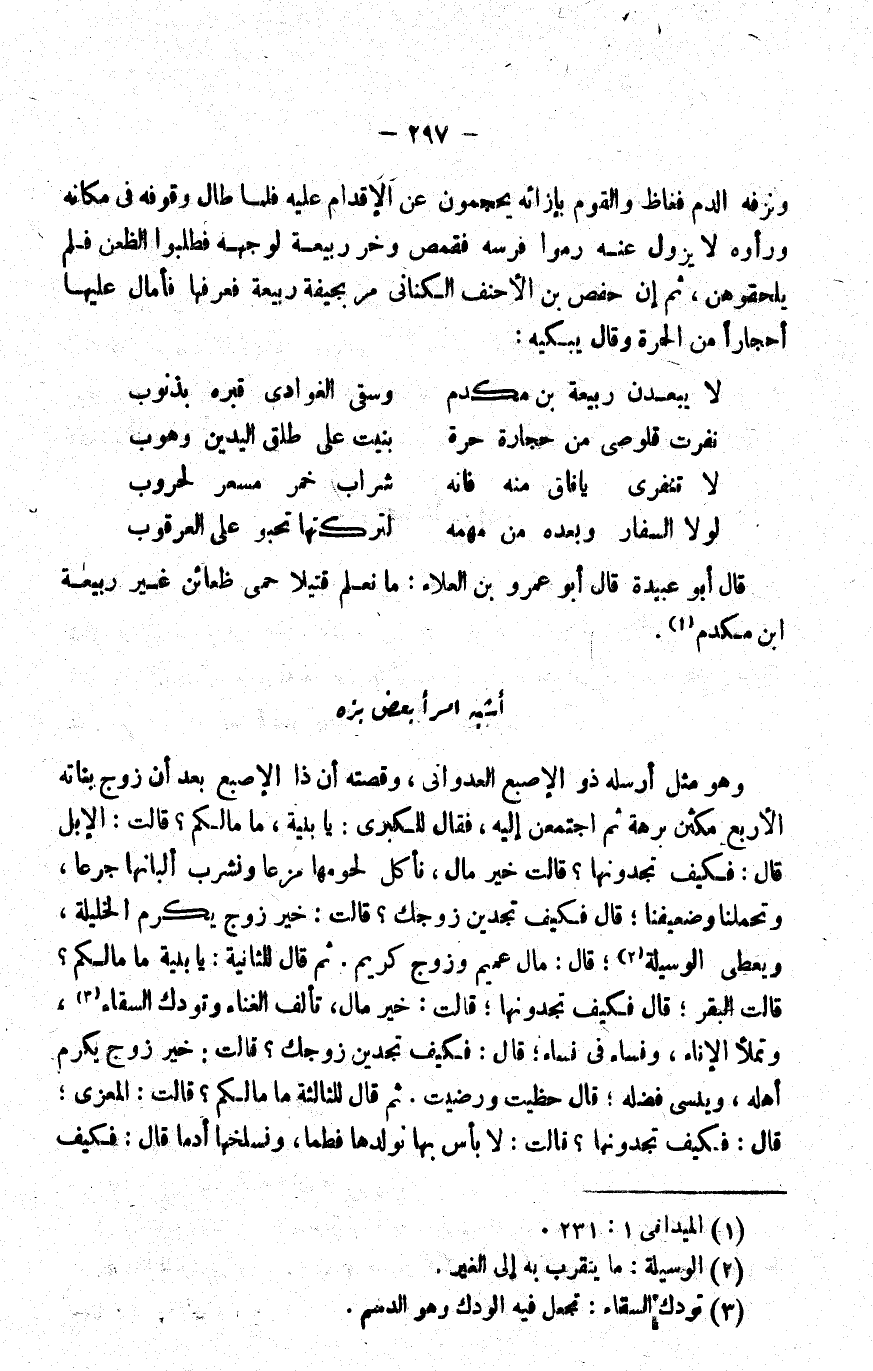 ونزفه الدم, فغاظ والقوم بإزائه يحجمون عن الإقدام عليه, فلما طال وقوفه في مكانه ورأوه لا يزول عنه رموا فرسه فقمص وخرّ ربيعة لوجهه, فطلبوا الظعن فلم يلحقوهن، ثم إن حفص بن الأحنف الكناني مر بجيفة ربيعة فعرفها, فأمال عليها أحجارا من الحرة, وقال يبكيه: