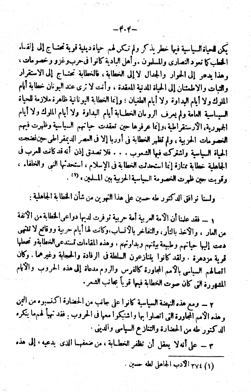 ولسنا نوافق الدكتور طه حسين على هذا التهوين من شأن الخطابة الجاهلية: