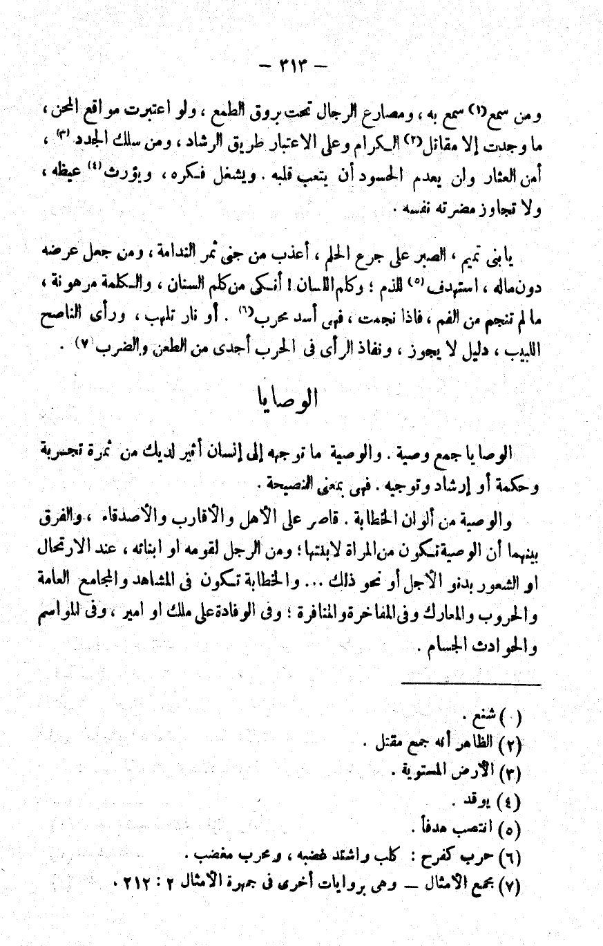 يا بني تميم، الصبر على جرع الحلم أعذب من جني ثمر الندامة، ومن جعل عرضه دون ماله استهدف5 للذم، وكلم اللسان أنكى من كلم السنان، والكلمة مرهونة ما لم تنجم من الفم، فإذا نجمت، فهي أسد محرب6, أو نار تلهب، ورأي الناصح اللبيب دليل لا يجوز، ونفاذ الرأي في الحرب أجدى من الطعن والضرب7.