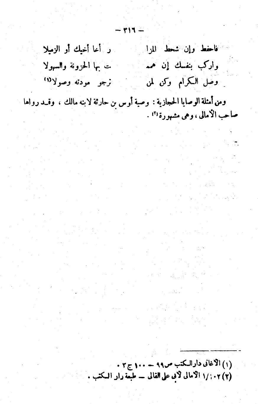 ومن أمثلة الوصايا الحجازية: وصية أوس بن حارثة لابنه مالك، وقد رواها صاحب الأمالي، وهي مشهورة2.