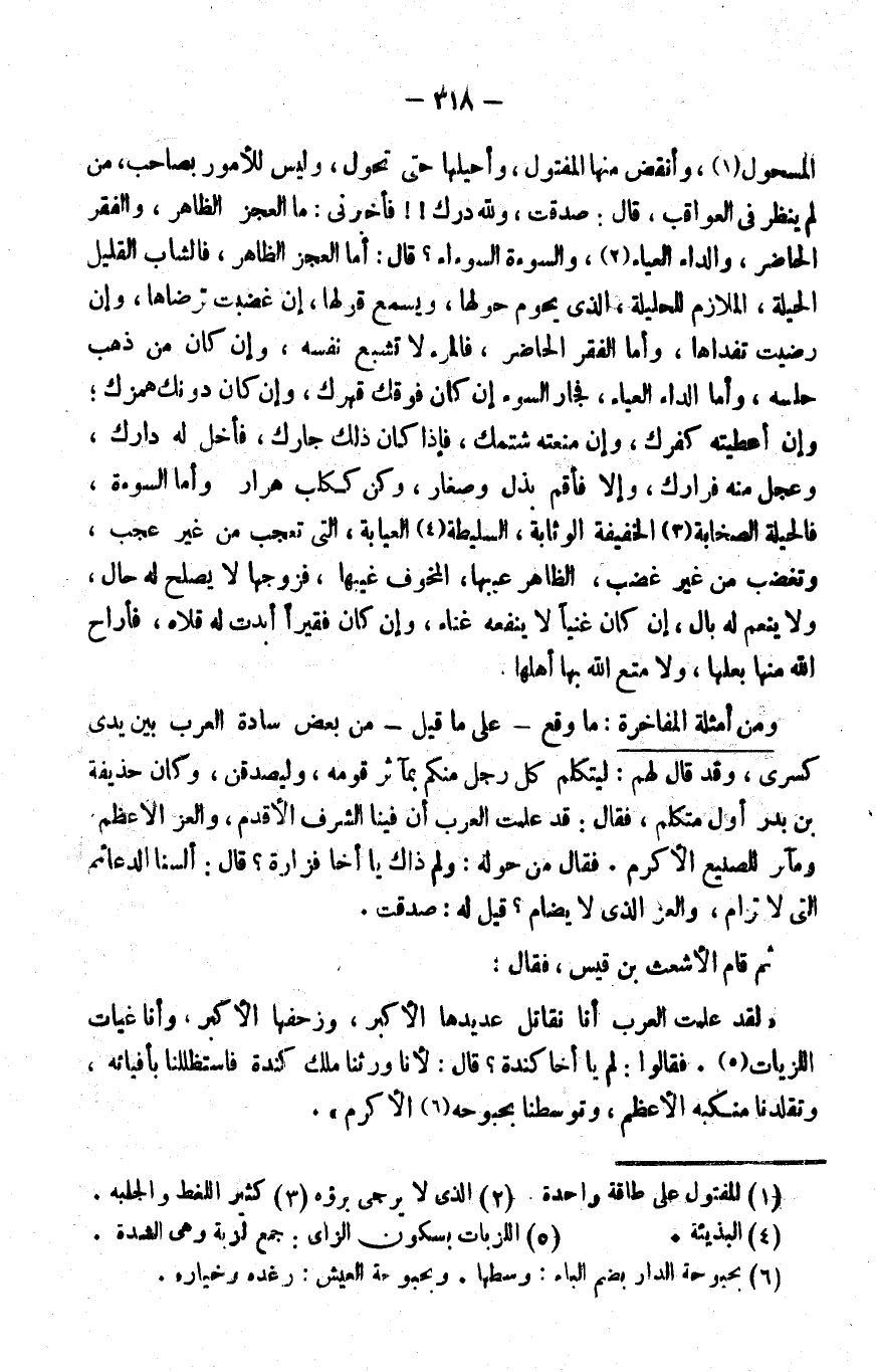 المسحول1، وأنقض منها المفتول، وأحيلها حتى تحول، وليس للأمور بصاحب، من لم ينظر في العواقب، قال: صدقت، لله درك!! فأخبرني: ما العجز الظاهر، والفقر الحاضر، والداء العياء2، والسوءة السوءاء؟ قال: أما العجز الظاهر، فالشاب القليل الحيلة، الملازم للحليلة، الذي يحوم حولها، ويسمع قولها، إن غضبت ترضَّاها، وإن رضيت تفدَّاها. وأما الفقر الحاضر, فالمرء لا تشبع نفسه، وإن كان من ذهب حلسه. وأما الداء العياء، فجار السوء إن كان فوقك قهرك، وإن كان دونك همزك، وإن أعطيته كفرك، وإن منعته شتمك، فإذا كان ذلك جارك، فأخلِ له دارك، وعجل منه فرارك، وإلا فأقم بذل وصغار، وكن ككلب هرار. وأما السوءة، فالحيلة الصخابة3, الخفيفة الوثابة، السليطة4 العيابة، التي تعجب من غير عجب، وتغضب من غير غضب، الظاهر عيبها، المخوف غيبها، فزوجها لا يصلح له حال، ولا ينعم له بال، إن كان غنيا لا ينفعه غناء، وإن كان فقيرا أبدت له قلاه، فأراح الله منها بعلها، ولا متع الله بها أهلها.