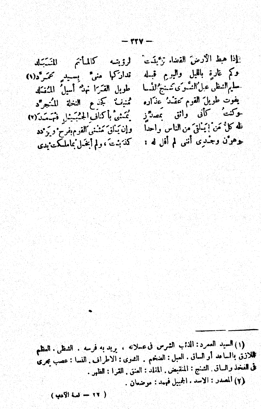 1 السيد العمرد: الذئب الشرس في عسلانه، يريد به فرسه. الشظى: العظم اللازق بالساعد أو الساق. العبل: الضخم. الشوى: الأطراف. النسا: عصب يجري في الفخذ والساق. الشنج: المنقبض. المقلد: العنق. القرا: الظهر.