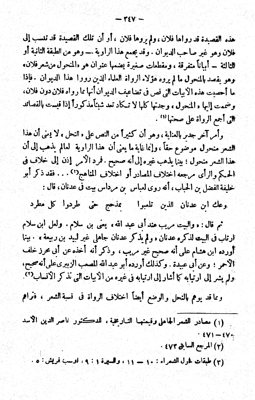 وأمر آخر جدير بالعناية، وهو أن كثيرا من النص على "النحل" لا يعني أن هذا الشعر منحول موضوع حقا، وإنما غاية ما يعني أن هذا الراوية لعالم يذهب إلى أن هذا الشعر منحول، بينما يذهب غيره إلى أنه صحيح. فمرد الأمر إذًا إلى خلاف في الحكم والرأي مرجعه اختلاف المصادر أو اختلاف المناهج2 ... فقد ذكر أبو خليفة الفضل بن الحباب, أنه روي لعباس بن مرداس بيت في عدنان، قال: