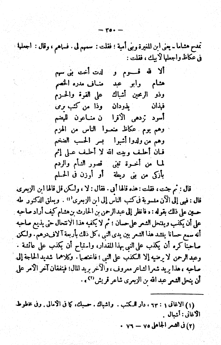 قال: ثم جئت، فقلت: هذه قالها أبي. فقال: لا، ولكن قل: قالها ابن الزبعرى، قال: فهي إلى الآن منسوبة في كتب الناس إلى ابن الزبعرى1. ويعلق الدكتور طه حسين على ذلك بقوله: "فانظر إلى عبد الرحمن بن الحارث بن هشام كيف أراد صاحبه على أن يكذب وينتحل الشعر على حسان؛ ثم لا يكفيه هذا الانتحال حتى يذيع صاحبه أنه سمع حسانا ينشد هذا الشعر بين يدي النبي، كل ذلك بأربعة آلاف درهم. ولكن صاحبنا كره أن يكذب على النبي بهذا المقدار، واستباح أن يكذب على عائشة. وعبد الرحمن لا يرضيه إلا الكذب على النبي؛ فاختصما. وكلاهما شديد الحاجة إلى صاحبه، هذا يريد شعرا لشاعر معروف، والآخر يريد المال؛ فيتفقان آخر الأمر على أن ينحل الشعر عبد الله بن الزبعرى شاعر قريش"2.