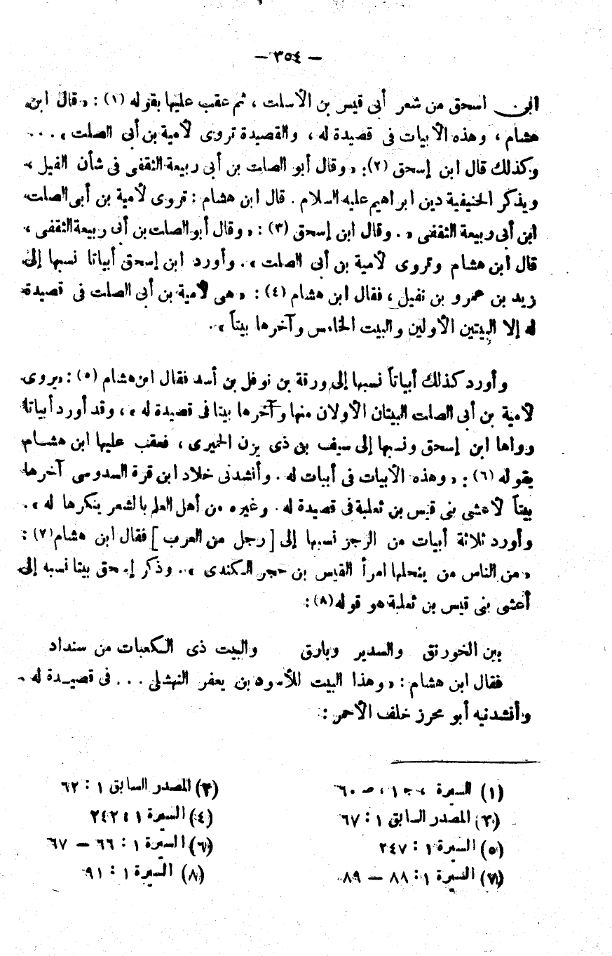 ابن إسحاق من شعر أبي قيس بن الأسلت، ثم عقب عليها بقوله1: "قال ابن هشام: وهذه الأبيات في قصيدة له، والقصيدة تروى لأمية بن أبي الصلت". وكذلك قال ابن إسحاق2: "وقال أبو الصلت بن أبي ربيعة الثقفي في شأن الفيل، ويذكر الحنيفية دين إبراهيم عليه السلام. قال ابن هشام: تروى لأمية بن أبي الصلت بن أبي ربيعة الثقفي". وقال ابن إسحاق3: "وقال أبو الصلت بن أبي ربيعة الثقفي، قال ابن هشام: وتروى لأمية بن أبي الصلت". وأورد ابن إسحاق أبياتا نسبها إلى زيد بن عمرو بن نفيل، فقال ابن هشام4: "هي لأمية بن أبي الصلت في قصيدة له, إلا البيتين الأولين والبيت الخامس وآخرها بيتا".