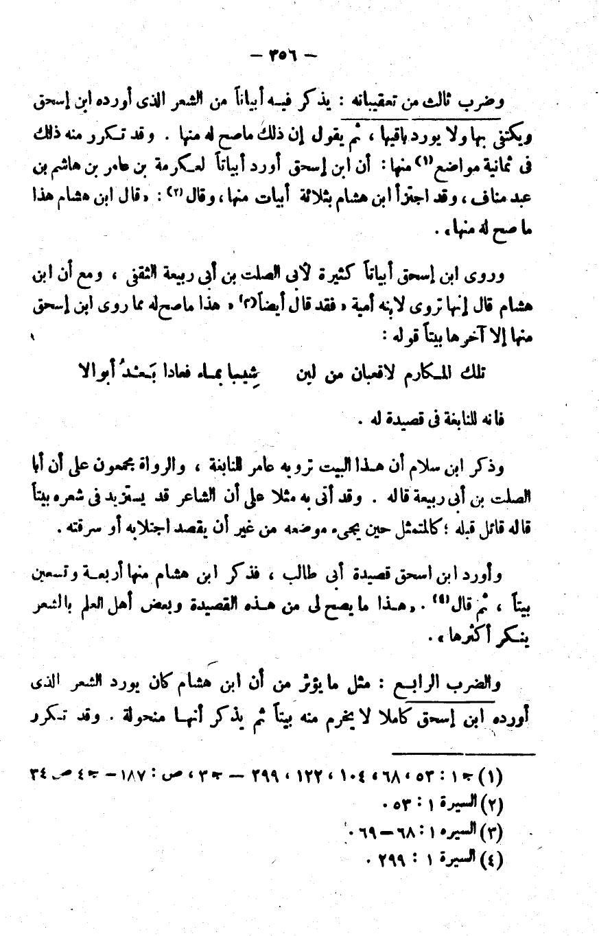 والضرب الرابع: مثل ما يؤثر من أن ابن هشام كان يورد الشعر الذي أورده ابن إسحاق كاملا لا يخرم منه بيتا, ثم يذكر أنها منحولة. وقد تكرر