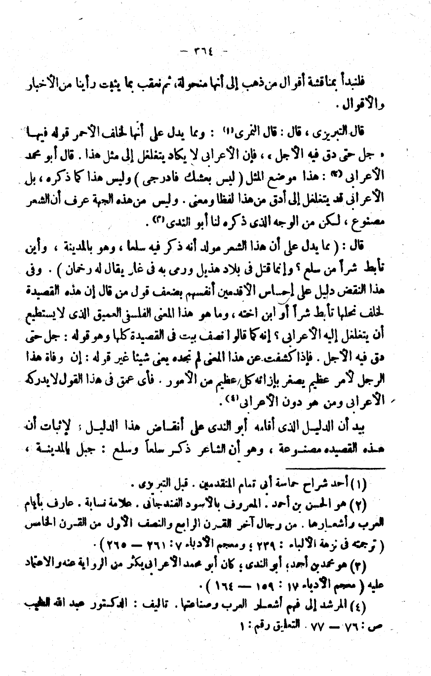 قال التبريزي: قال: قال النمري1: ومما يدل على أنها لخلف الأحمر قوله فيها: "جل حتى دق فيه الأجل"، فإن الأعرابي لا يكاد يتغلغل إلى مثل هذا. قال أبو محمد الأعرابي2: هذا موضع المثل: "ليس بعشك فادرجي" وليس هذا كما ذكره، بل الأعرابي قد يتغلغل إلى أدق من هذا لفظا ومعنى, وليس من هذه الجهة عرف أن الشعر مصنوع، لكن من الوجه الذي ذكره لنا أبو الندى3.