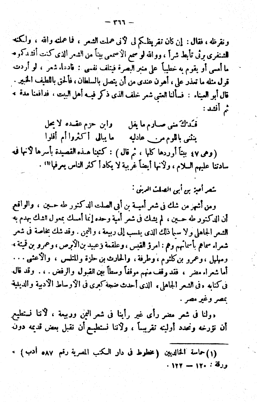 ومن أشهر من شك في شعر أمية بن أبي الصلت الدكتور طه حسين، والواقع أن الدكتور طه حسين لم يشك في شعر أمية وحده, إنما أمسك بمعول الشك يهدم به الشعر الجاهلي ولا سيما ذلك الذي ينسب إلى ربيعة، واليمن. وقد شك بخاصة في شعر شعراء سماهم بأسمائهم, وهم: امرؤ القيس، وعلقمة, وعبيد بن الأبرص، وعمرو بن قميئة, ومهلهل، وعمرو بن كلثوم، وطرفة، والحارث بن حلزة, والمتلمس، والأعشى ... أما شعراء مضر، فقد وقف منهم موقفا وسطا بين القبول والرفض. وقد قال في كتابه "في الشعر الجاهلي" الذي أحدث ضجة كبرى في الأوساط الأدبية والدينية بمصر وغير مصر: