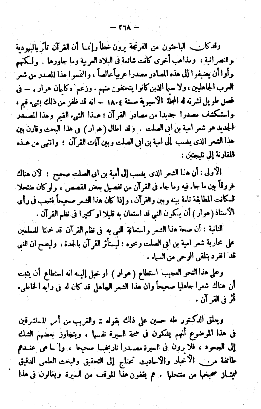 الأولى: أن هذا الشعر الذي ينسب إلى أمية بن أبي الصلت صحيح؛ لأن هناك فروقا بين ما جاء فيه وما جاء في القرآن من تفصيل بعض القصص، ولو كان منتحلا لكانت المطابقة تامة بينه وبين القرآن، وإذا كان هذا الشعر صحيحا فيجب في رأي الأستاد "هوار" أن يكون النبي قد استعان به قليلا أو كثيرا في نظم القرآن.