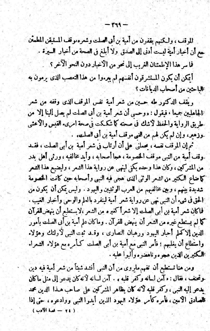 ثم إن الموقف نفسه، يحملني على أن أرتاب في شعر أمية بن أبي الصلت، فقد وقف أمية من النبي موقف الخصومة، هجا أصحابه، وأيد مخالفيه، ورثى أهل بدر من المشركين، وكان هذا وحده يكفي لينهى عن رواية هذا الشعر، وليضيع هذا الشعر كما ضاع الكثير من الشعر الوثني الذي هجي فيه النبي وأصحابه حين كانت الخصومة شديدة بينهم، وبين مخالفيهم من العرب الوثنيين واليهود. وليس يمكن أن يكون من الحق في شيء أن النبي نهى عن رواية شعر أمية لينفرد بالعلم والوحي وأخبار الغيب؛ فما كان شعر أمية بن أبي الصلت إلا شعرا كغيره من الشعر، لا يستطيع أن ينهض للقرآن كما لم يستطع غيره من الشعر أن ينهض القرآن. وما كان علم أمية بن أبي الصلت بأمور الدين إلا كعلم أحبار اليهود ورهبان النصارى، وقد ثبت النبي لأولئك وهؤلاء واستطاع أن يغلبهم، فأمر النبي مع أمية بن أبي الصلت كأمره مع هؤلاء الشعراء الكثيرين الذين هجوه وناهضوه وألبوا عليه.