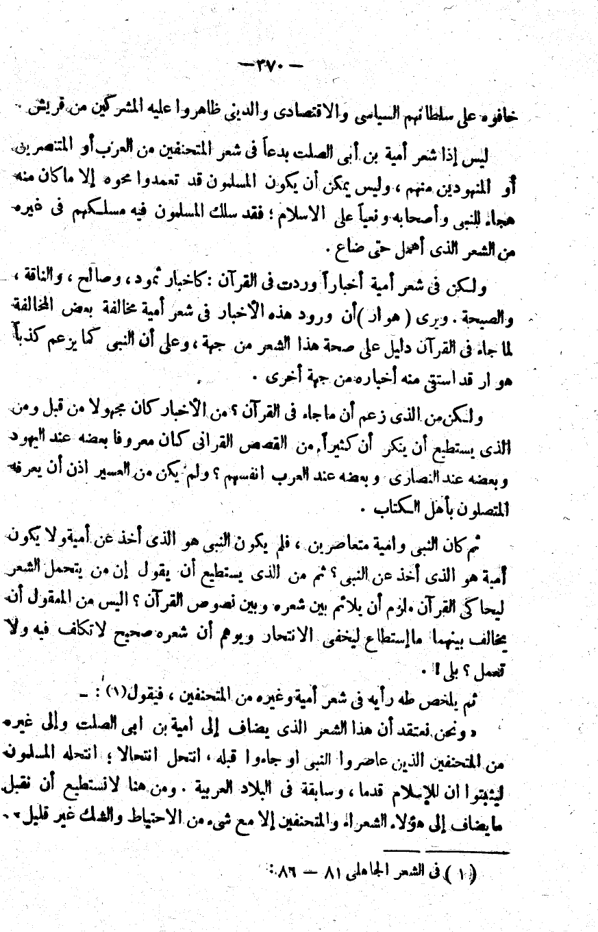 "ونحن نعتقد أن هذا الشعر الذي يضاف إلى أمية بن أبي الصلت, وإلى غيره من المتحنفين الذين عاصروا النبي أو جاءوا قبله، انتحل انتحالا، انتحله المسلمون ليثبتوا إن للإسلام قدما وسابقة في البلاد العربية. ومن هنا لا نستطيع أن نقبل ما يضاف إلى هؤلاء الشعراء والمتحنفين إلا مع شيء من الاحتياط والشك غير قليل".