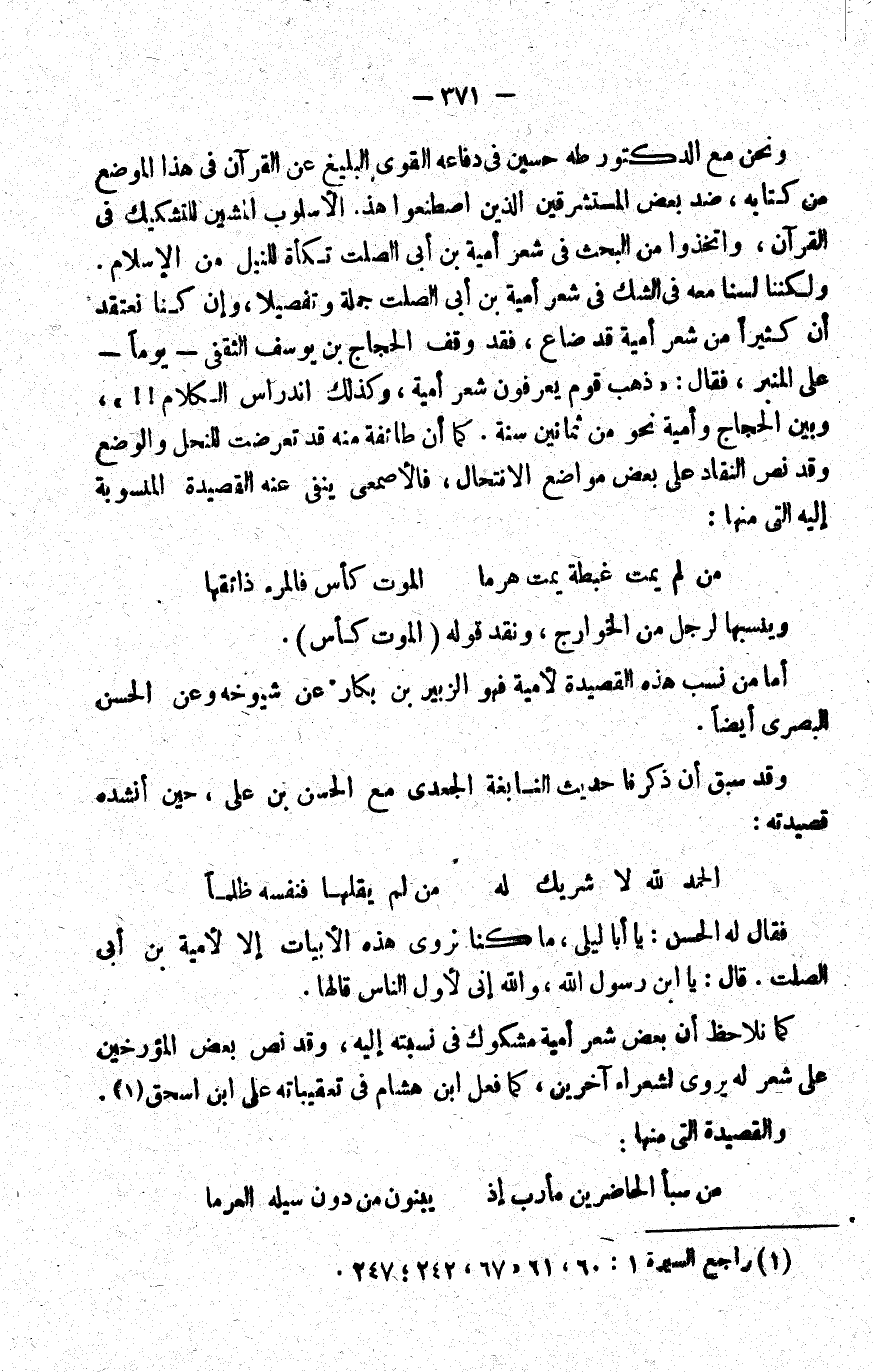 ونحن مع الدكتور طه حسين في دفاعه القوي البليغ عن القرآن في هذا الموضع من كتابه، ضد بعض المستشرقين الذين اصطنعوا هذا الأسلوب المشين للتشكيك في القرآن، واتخذوا من البحث في شعر أمية بن أبي الصلت تكأة للنيل من الإسلام, ولكننا لسنا معه في الشك في شعر أمية بن أبي الصلت جملة وتفصيلا، وإن كنا نعتقد أن كثيرا من شعر أمية قد ضاع، فقد وقف الحجاج بن يوسف الثقفي -يوما- على المنبر، فقال: "ذهب قوم يعرفون شعر أمية، وكذلك اندراس الكلام!! "، وبين الحجاج وأمية نحو من ثمانين سنة. كما أن طائفة منه قد تعرضت للنحل والوضع, وقد نص النقاد على بعض مواضع الانتحال؛ فالأصمعي ينفي عنه القصيدة المنسوبة إليه التي منها: