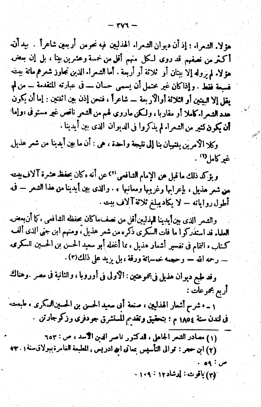 ويؤكد ذلك ما قيل عن الإمام الشافعي2 عن أنه "كان يحفظ عشرة آلاف بيت من شعر هذيل، بإعرابها وغريبها ومعانيها". والذي بين أيدينا من هذا الشعر -في أطول رواياته- لا يكاد يبلغ ثلاثة آلاف بيت.