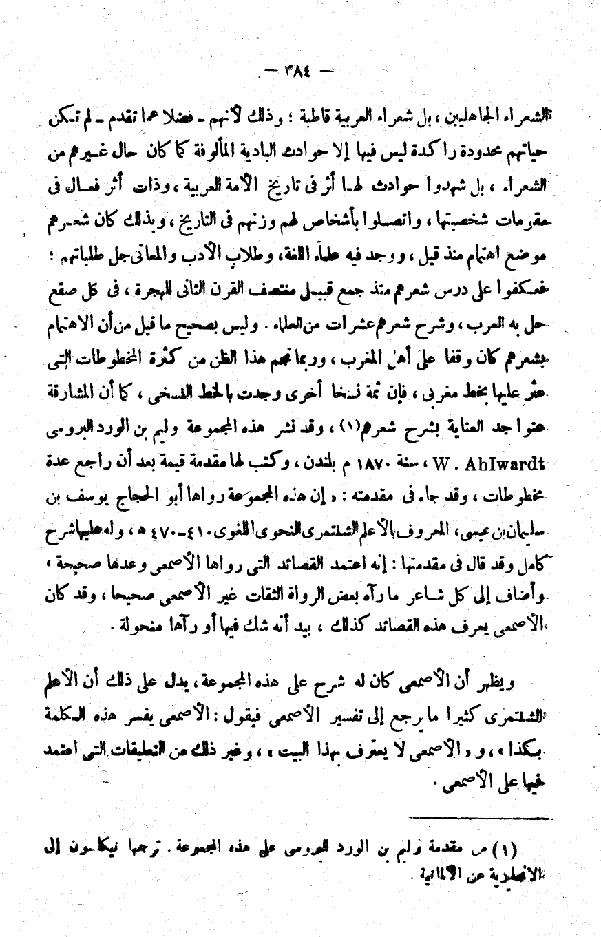 الشعراء الجاهليين، بل شعراء العربية قاطبة؛ وذلك لأنهم -فضلا عما تقدم- لم تكن حياتهم محدودة راكدة ليس فيها إلا حوادث البادية المألوفة كما كان حال غيرهم من الشعراء، بل شهدوا حوادث لها أثر في تاريخ الأمة العربية، وذات أثر فعال في مقومات شخصيتها، واتصلوا بأشخاص لهم وزنهم في التاريخ، وبذلك كان شعرهم موضع اهتمام منذ قيل، ووجد فيه علماء اللغة وطلاب الأدب والمعاني جل طلباتهم، فعكفوا على درس شعرهم منذ جمع قبيل منتصف القرن الثاني للهجرة، في كل صقع حل به العرب، وشرح شعرهم عشرات من العلماء، وليس بصحيح ما قيل من أن الاهتمام بشعرهم كان وقفا على أهل المغرب، وربما نجم هذا الظن من كثرة المخطوطات التي عثر عليها بخط مغربي، فإن ثمة نسخا أخرى وجدت بالخط النسخي، كما أن المشارقة عنوا جد العناية بشرح شعرهم1، وقد نشر هذه المجموعة وليم بن الورد البروسي W. Ahlwardt سنة 1870م بلندن، وكتب لها مقدمة قيمة بعد أن راجع عدة مخطوطات، وقد جاء في مقدمته: "إن هذه المجموعة رواها أبو الحجاج يوسف بن سليمان بن عيسى، المعروف بالأعلم الشنتمري النحوي اللغوي 410-470هـ، وله عليها شرح كامل وقد قال في مقدمتها: إنه اعتمد القصائد التي رواها الأصمعي وعدها صحيحة، وأضاف إلى كل شاعر ما رآه بعض الرواة الثقات غير الأصمعي صحيحا، وقد كان الأصمعي يعرف هذه القصائد كذلك، بيد أنه شك فيها أو رآها منحولة.