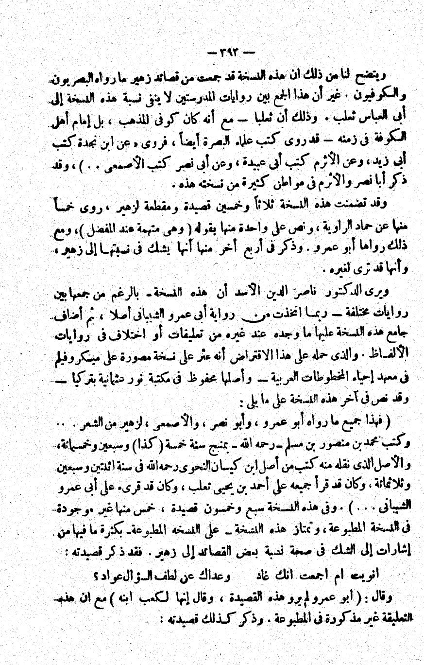 ويتضح لنا من ذلك أن هذه النسخة قد جمعت من قصائد زهير ما رواه البصريون والكوفيون, غير أن هذا الجمع بين روايات المدرستين لا ينفي نسبة هذه النسخة إلى أبي العباس ثعلب. وذلك أن ثعلبا -مع أنه كان كوفي المذهب، بل إمام أهل الكوفة في زمنه- قد روى كتب علماء البصرة أيضا، فروى "عن ابن نجدة كتب أبي زيد، وعن الأثرم كتب أبي عبيدة، وعن أبي نصر كتب الأصمعي ... "، وقد ذكر أبا نصر والأثرم في مواطن كثيرة من نسخته هذه.