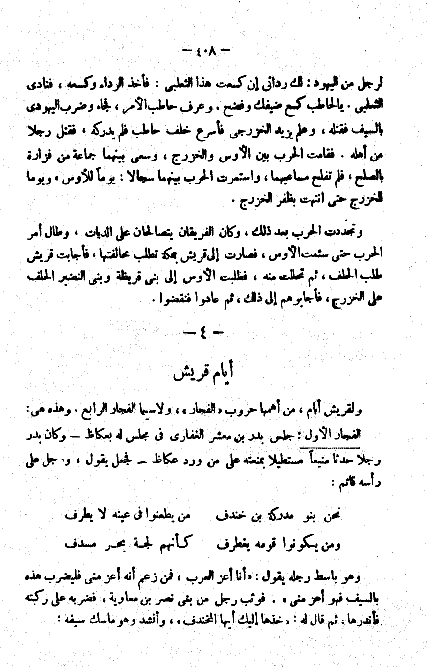 الفجار الأول: جلس بدر بن معشر الغفاري في مجلس له بعكاظ -وكان بدر رجلا حدثا منيعا مستطيلا بمنعته على من ورد عكاظ- فجعل يقول، ورجل على رأسه قائم: