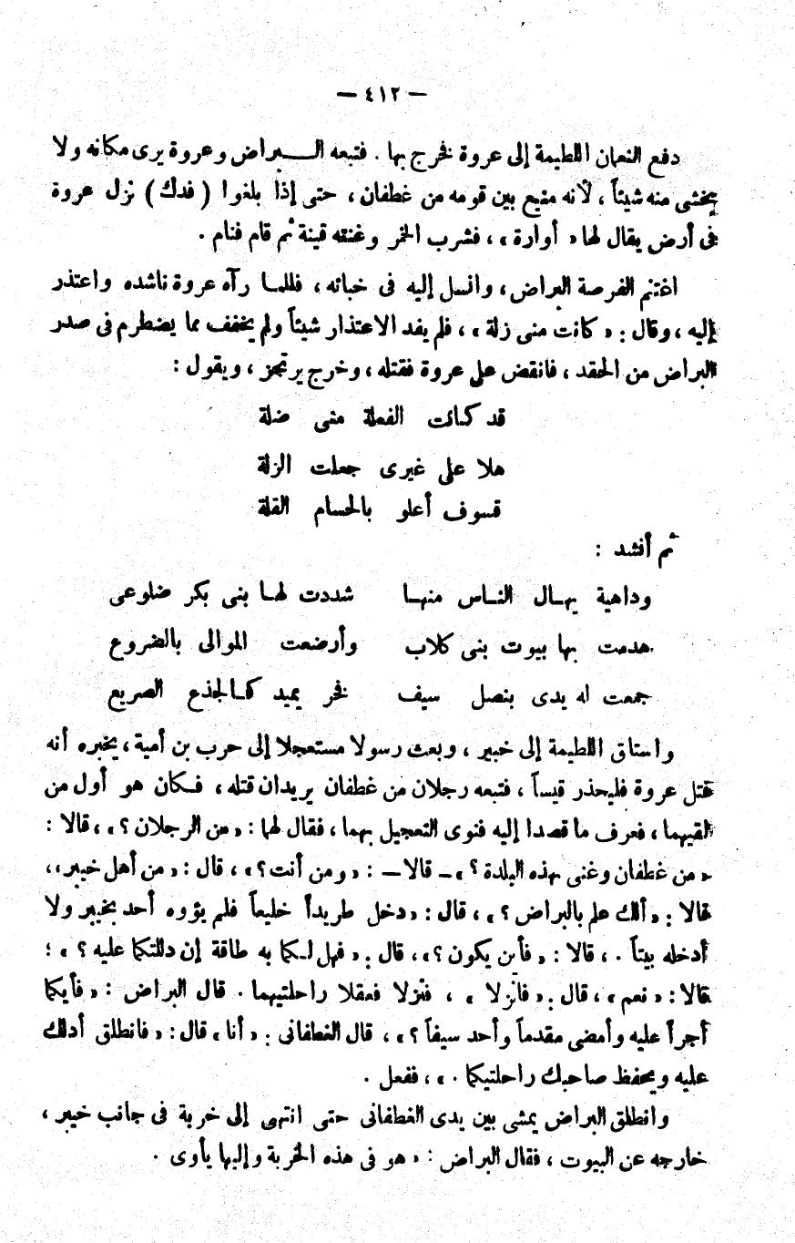 ودفع النعمان اللطيمة إلى عروة فخرج بها, فتبعه البراض وعروة يرى مكانه ولا يخشى منه شيئا؛ لأنه منيع بين قومه من غطفان، حتى إذا بلغوا "فدك" نزل عروة في أرض يقال لها "أوارة", فشرب الخمر وغنته قينة ثم قام فنام.