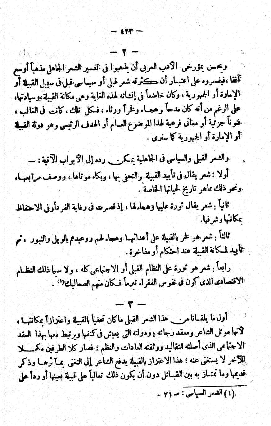 ويحسن بمؤرخي الأدب العربي أن يذهبوا في تفسير الشعر الجاهلي مذهبا أوسع أفقا، فيفسروه على اعتبار أن كثرته شعر قبلي أو سياسي قيل في سبيل القبيلة أو الإمارة أو الجمهورية، وكان خاضعا في إنشائه لهذه الغاية وهي مكانة القبيلة، وسيادتها، على الرغم من أنه كان مدحا وهجاء وفخرا ورثاء، فكل تلك, كانت في الغالب فنونا جزئية أو معاني فرعية لهذا الموضوع العام أو الهدف الرئيسي, وهو دولة القبيلة أو الإمارة أو الجمهورية كما سنرى.