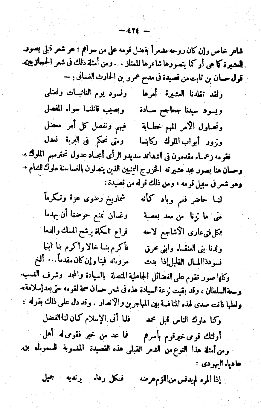 شاعر خاص, وإن كان روحه مشعرا بفضل قومه على من سواهم؛ هو شعر قبلي يصور العشيرة كما هي أو كما يتصورها شاعرها الممتاز ... ومن أمثلة ذلك في شعر الحجازيين قول حسان بن ثابت من قصيدة في مدح عمرو بن الحارث الغساني: