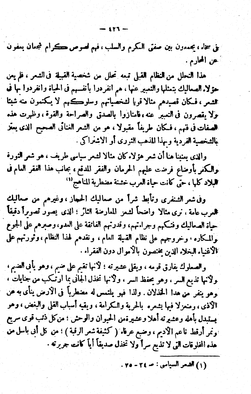 والذي يعنينا هنا أن شعر هؤلاء كان مثالا لشعر سياسي طريف، هو شعر الثورة والكفر بأوضاع فرضت عليهم الحرمان والفقر المدقع، بجانب هذا الفقر العام في البلاد كلها، حتى كانت حياة العرب خشنة مضطربة المناهج1.