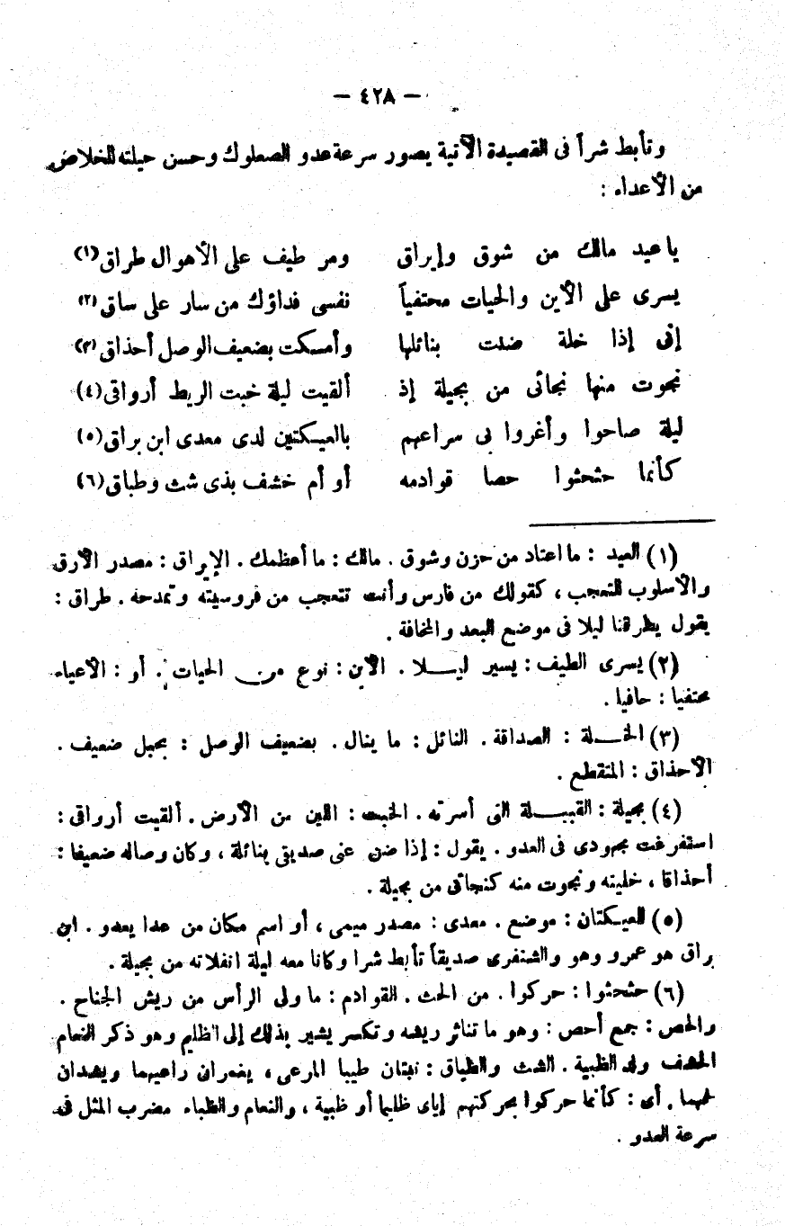 1 العيد: ما اعتاد من حزن وشوق. ما لك: ما أعظمك. الإيراق: مصدر الأرق والأسلوب للتعجب، كقولك من فارس وأنت تتعجب من فروسيته وتمدحه. طرق: يقول: يطرقنا ليلا في موضع البعد والمخافة.