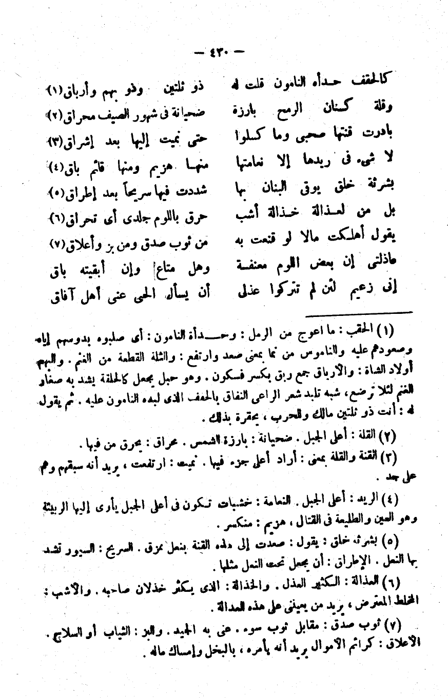 1 الحلقب: ما أعوج من الرمل: وحدأة النامون: أي صلبوه بدوسهم إياه وصعودهم عليه والناموس من نما بمعنى صمد وارتفع: والثلة القطعة من الغنم. وإليهم أولاد الشاة: والأرباق جمع ربق بكسر فسكون. وهو حبل يجعل كالحلقة يشد به صغار الغنم لئلا ترضع، شبه تلبد شعر الاعي النفاق بالحفف الذي لبده النامون عليه. ثم يقول له: أنت ذو ثلتين مالك وللحرب، يحقرة بذلك.