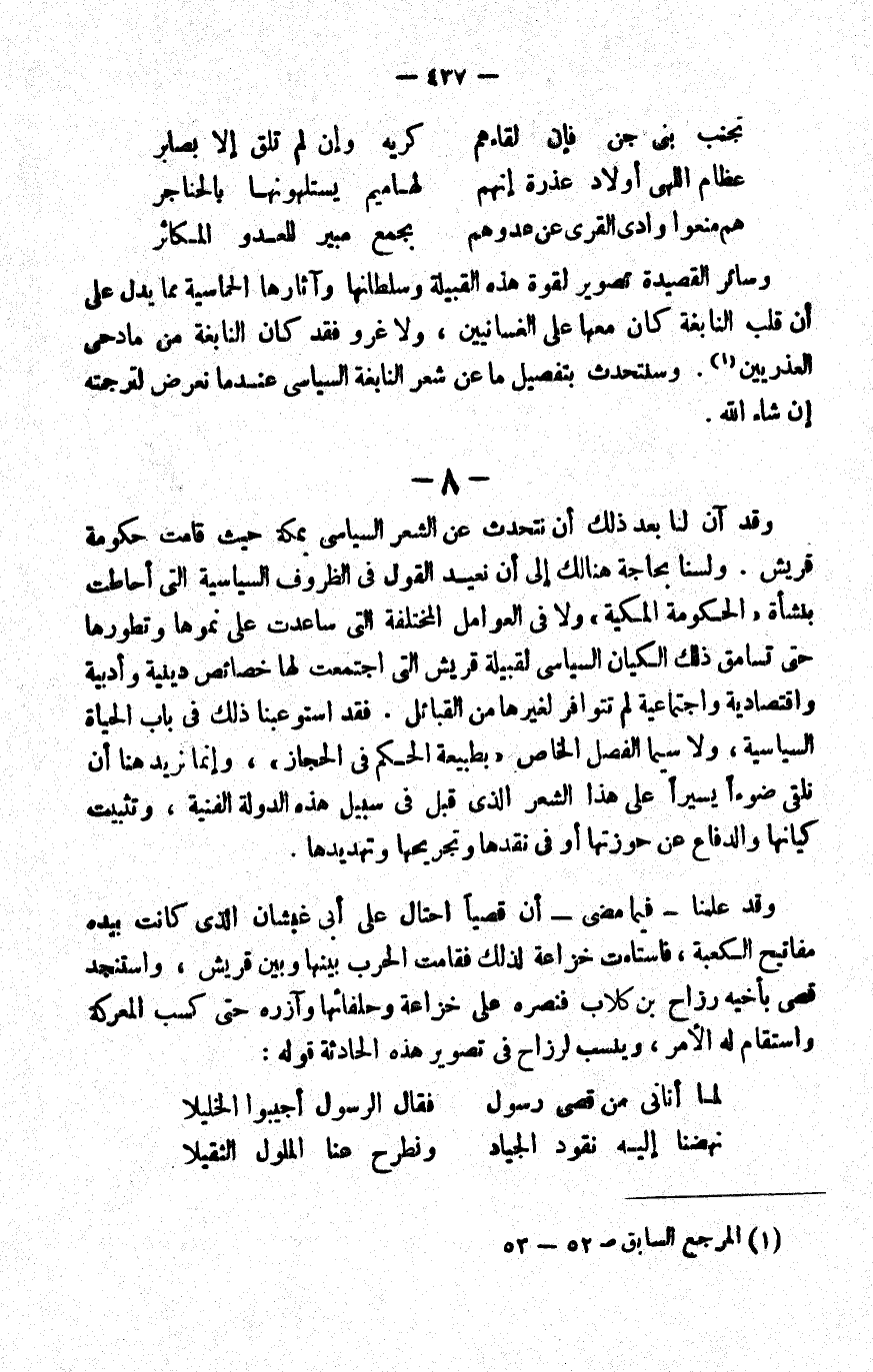 8- وقد آن لنا بعد ذلك أن نتحدث عن الشعر السياسي بمكة حيث قامت حكومة قريش. ولسنا بحاجة هنالك إلى أن نعيد القول في الظروف السياسية التي أحاطت بنشأة "الحكومة المكية" ولا في العوامل المختلفة التي ساعدت على نموها وتطورها حتى تسامق ذلك الكيان السياسي لقبيلة قريس, التي اجتمعت لها خصائص دينية وأدبية واقتصادية واجتماعية لم تتوافر لغيرها من القبائل. فقد استوعبنا ذلك في باب الحياة السياسية، ولا سيما الفصل الخاص "بطبيعة الحكم في الحجاز"، وإنما نريد هنا أن نلقي ضوءا يسيرا على هذا الشعر الذي قيل في سبيل هذه الدولة الفنية، وتثبيت كيانها والدفاع عن حوزتها أو في نقدها وتجريحها وتهديدها.