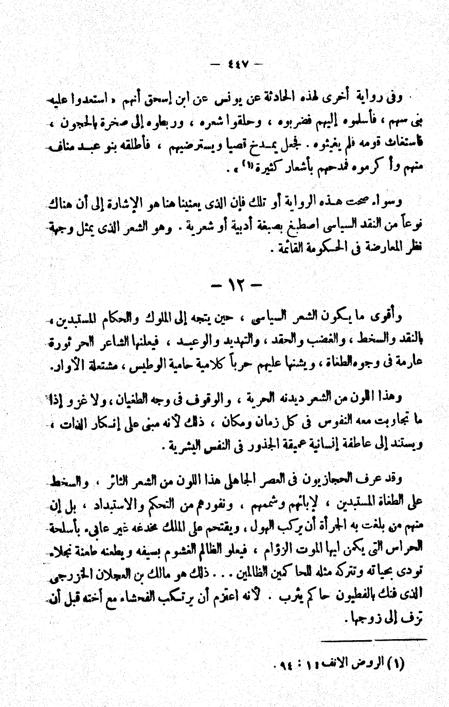 وقد عرف الحجازيون في العصر الجاهلي هذا اللون من الشعر الثائر، والسخط على الطغاة المستبدين؛ لإبائهم وشممهم، ونفورهم من التحكم والاستبداد، بل إن منهم من بلغت به الجرأة أن يركب الهول، ويقتحم على الملك مخدعه غير عابئ بأسلحة الحراس التي يكمن فيها الموت الزؤام، فيعلو الظالم الغشوم بسيفه ويطعنه طعنة نجلاء تودي بحياته وتتركه مثلة للحاكمين الظالمين ... ذلك هو مالك بن العجلان الخزرجي الذي فتك بالفطيون حاكم يثرب؛ لأنه اعتزم أن يرتكب الفحشاء مع أخته قبل أن تزف إلى زوجها.