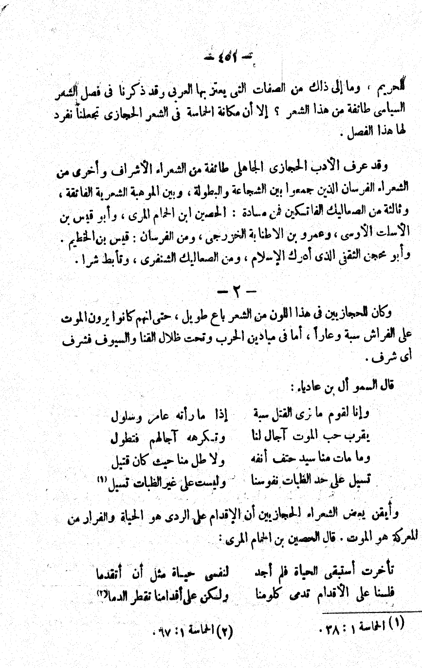 2- وكان للحجازيين في هذا اللون من الشعر باع طويل, حتى إنهم كانوا يرون الموت على الفراش سبة وعارا، أما في ميادين الحرب وتحت ظلال القنا والسيوف فشرف, أي شرف.