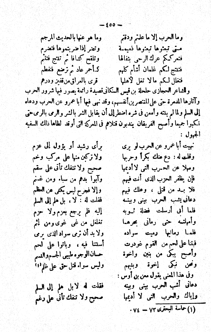 وللشاعر الحجازي حلحلة بن قيس الكناني قصيدة رائعة يصور فيها شرور الحرب وآثارها المدمرة حتى على المنتصرين أنفسهم، وقد نهى فيها أبا عمرو عن الحرب ودعاه إلى السلم, ولما لم ينته وأمعن في شره اضطر إلى أن يقابل الشر بالشر والرمي بالرمي, حتى نكبوا جميعا وأصبح الفريقان يندبون قتلاهم في المعركة التي أوقد لظاها ذلك السفيه الجهول: