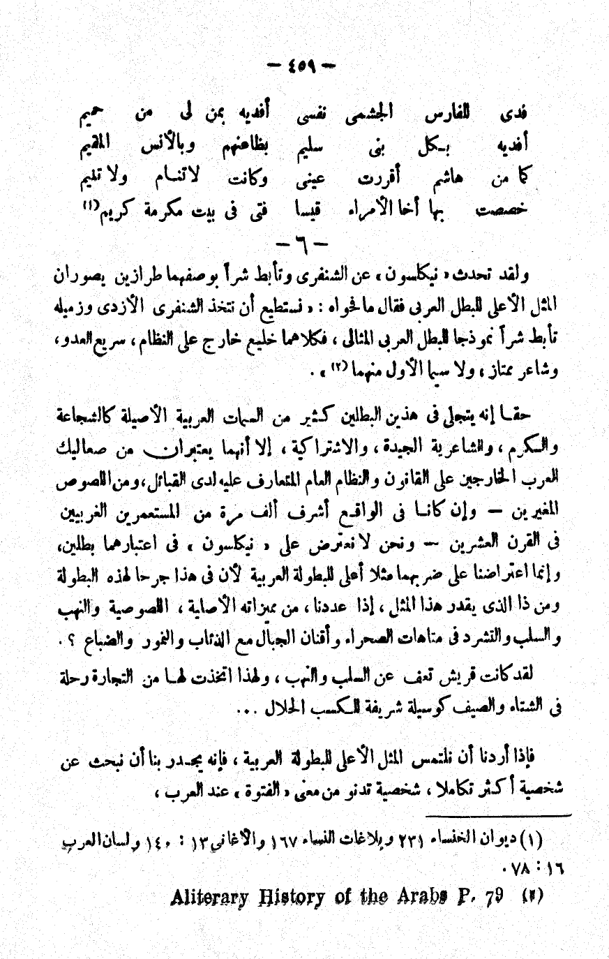 حقا, إنه يتجلى في هذين البطلين كثير من السمات العربية الأصيلة؛ كالشجاعة والكرم, والشاعرية الجيدة، والاشتراكية، إلا أنهما يعتبران من صعاليك العرب الخارجين على القانون والنظام العام المتعارف عليه لدى القبائل، ومن اللصوص المغيرين -وإن كانا في الواقع أشرف ألف مرة من المستعمرين الغربيين في القرن العشرين- ونحن لا نعترض على "نيكلسون" في اعتبارهما بطلين، وإنما اعتراضنا على ضربهما مثلا أعلى للبطولة العربية؛ لأن في هذا جرحا لهذه البطولة, ومن ذا الذي يقدر هذا المثل، إذا عددنا من مميزاته الأصلية, اللصوصية والنهب والسلب والتشرد في متاهات الصحراء وأقنان الجبال مع الذئاب والنمور والضباع؟!