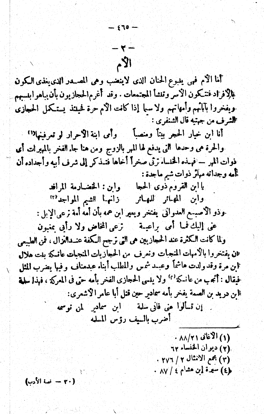 أما الأم فهي ينبوع الحنان الذي لا ينضب, وهي المصدر الذي يغذي الكون بالأفراد, فتتكون الأسر وتنشأ المجتمعات. وقد أغرم الحجازيون بأن يباهوا بنسبهم ويفخروا بآبائهم وأمهاتهم, ولا سيما إذا كانت الأم حرة, فحينئذ يستكمل الحجازي الشرف من جهتيه. قال الشنفرى: